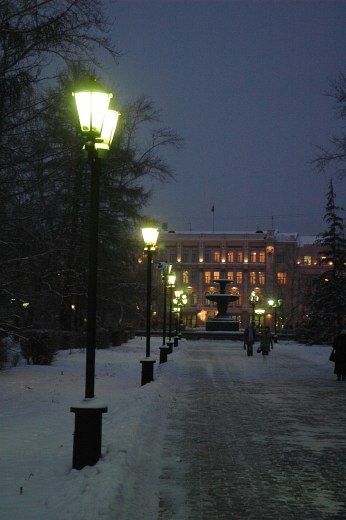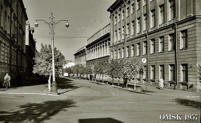 По этим строчкам можно представить Омск столетней давности. Улица, в тумане мерцают газовые фонари, светятся желатинные коробки номеров на углах. Из окон домов падают аккуратные, в виде правильных призм, окрашенные снопы света. На улицах фонари - электрические, в переулках - керосиновые. Перед каждой лампой укреплен большой сосуд с черным раствором. Это плоская стеклянная ваза в виде огромной пузатой фляжки, шар может быть красным, желтым, синим. Лучи лампы проходят сквозь окрашенную призму и падают на улицу.
