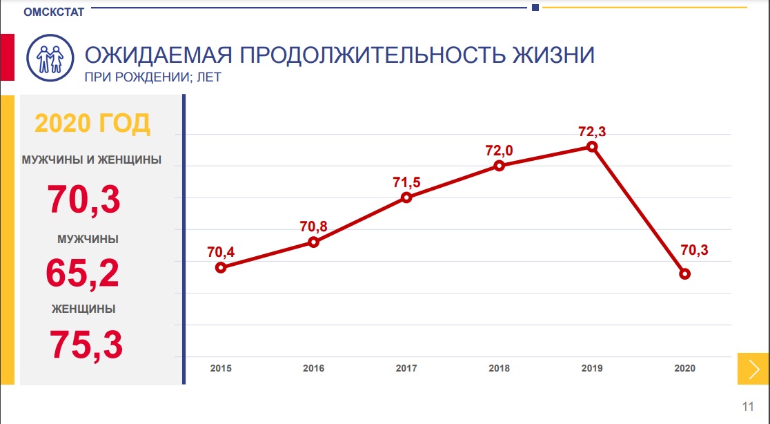 Как видно из отчета Омскстата, с 2015 по 2019 год ожидаемая продолжительность жизни при рождении среди омичей год от года росла и достигла к 2019 году в среднем 72,3 года, однако в 2020 году зафиксирован резкий спад.