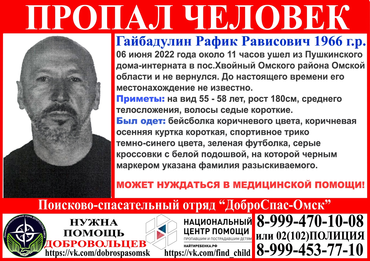 Поисково-спасательный отряд «Доброспас» 9 июня 2022 года сообщает о розыске 56-летнего Рафика Гайбадулина. Мужчина ушел из Пушкинского дома-интерната в поселке Хвойный Омского района Омской области и пропал.