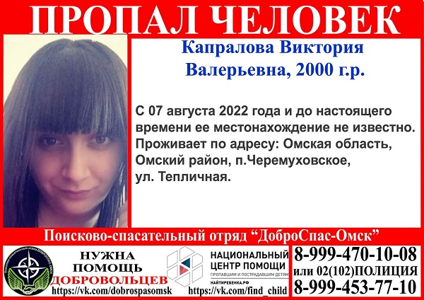 Волонтеры поискового отряда «Доброспас» сообщают 30 августа 2022 года о розыске 22-летней Виктории Капраловой. О ней ничего неизвестно с 7 августа 2022 года. Девушка проживает в Омском район, поселок Черемуховское, улица Тепличная.
