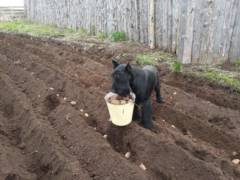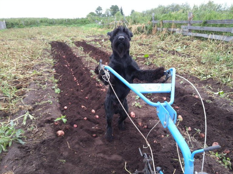 О трудовых подвигах ризеншнауцера по кличке Лимон пишет хозяин собаки Александр Матыцин на своей странице в соцсети «ВКонтакте». Весной житель города Тары Омской области выложил фотографии с собакой, носящей ведра с картофелем для посадки.