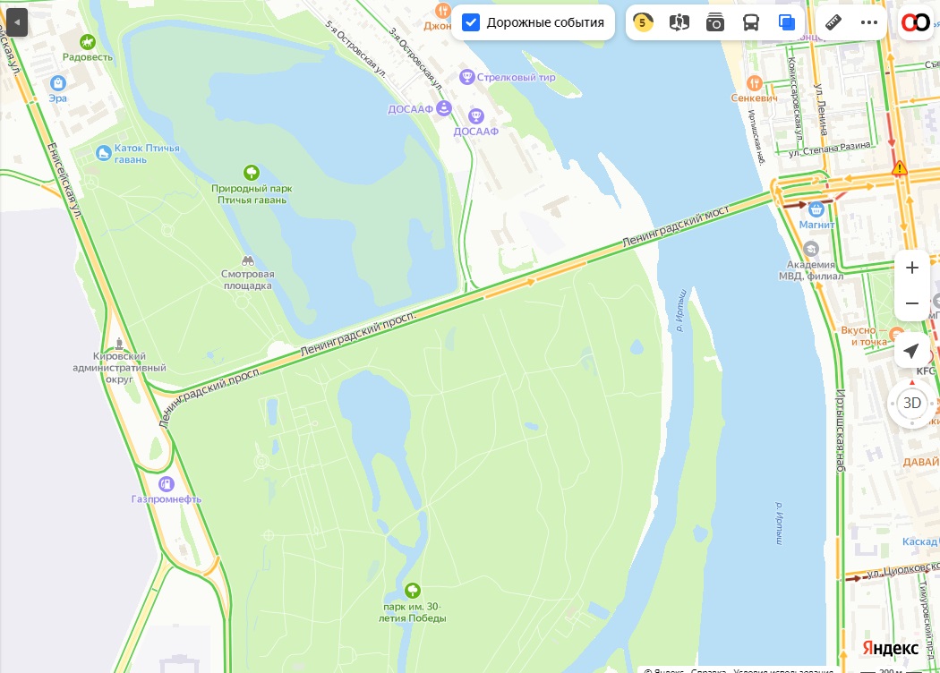 В четверг, 16 февраля 2023 года, в Омске уже второй день частично перекрыто движение по Ленинградскому мосту со стороны Левого берега в центр города. При этом, судя по данным сервиса «Яндекс.Пробки», на мосту на момент публикации достаточно свободно: движение на въезде на мост со стороны улицы Суворова осуществляется без проблем.