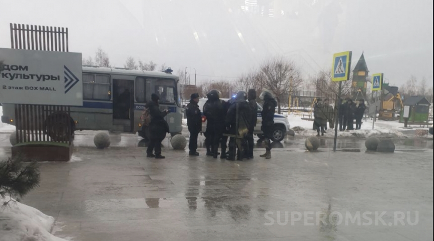 На кадрах виден автомобиль УМВД по Омской области, вероятно, в него помещали задержанных.