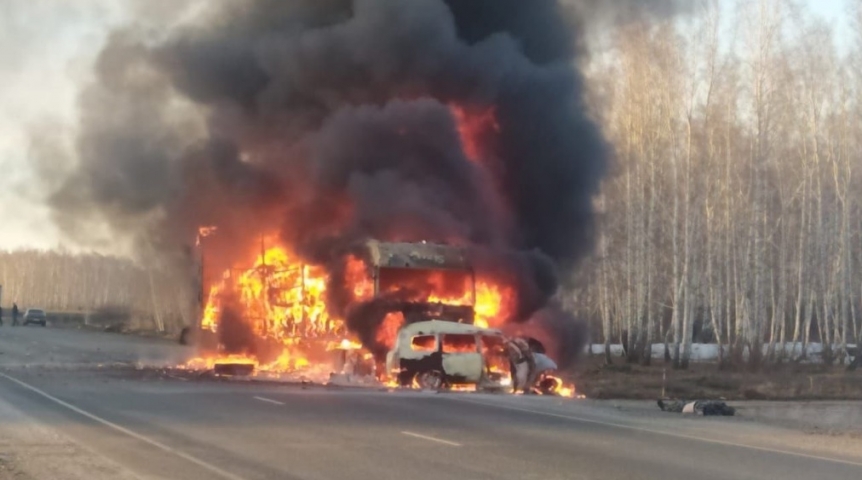 По данным правоохранителей, водитель автомобиля «Тойота» 1975 года рождения в районе 785-го километра трассы выехал на встречную полосу, где допустил столкновение с большегрузом «Мерседес», после чего обе машины загорелись.