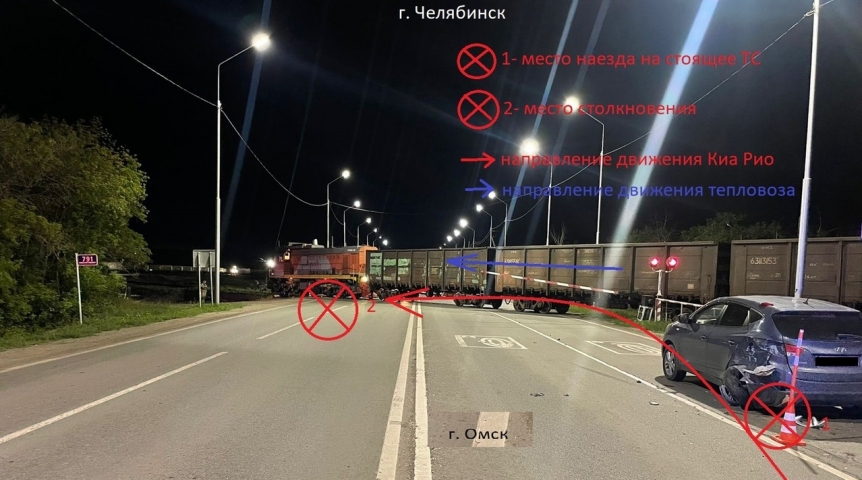 По предварительной информации правоохранителей, 42-летний водитель автомобиля «Киа Рио» ехал по трассе Челябинск – Новосибирск, где в районе 791-го километра не справился с управлением и допустил наезд на стоящий перед железнодорожным переездом автомобиль «Хендэ», после чего проехал на запрещающий сигнал светофора и допустил столкновение с грузовым тепловозом с 11 порожними вагонами, в этот момент пересекавшим дорогу.