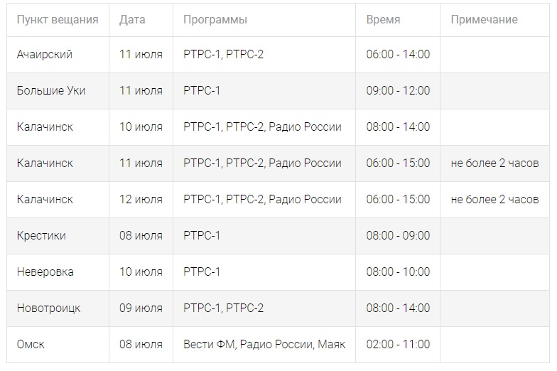 Так, кратковременные отключения телевизора на следующей неделе ожидаются в Омском Большеуковском, Калачинском, Оконешниковском и Таврическом районах Омской области, а также в Омске.