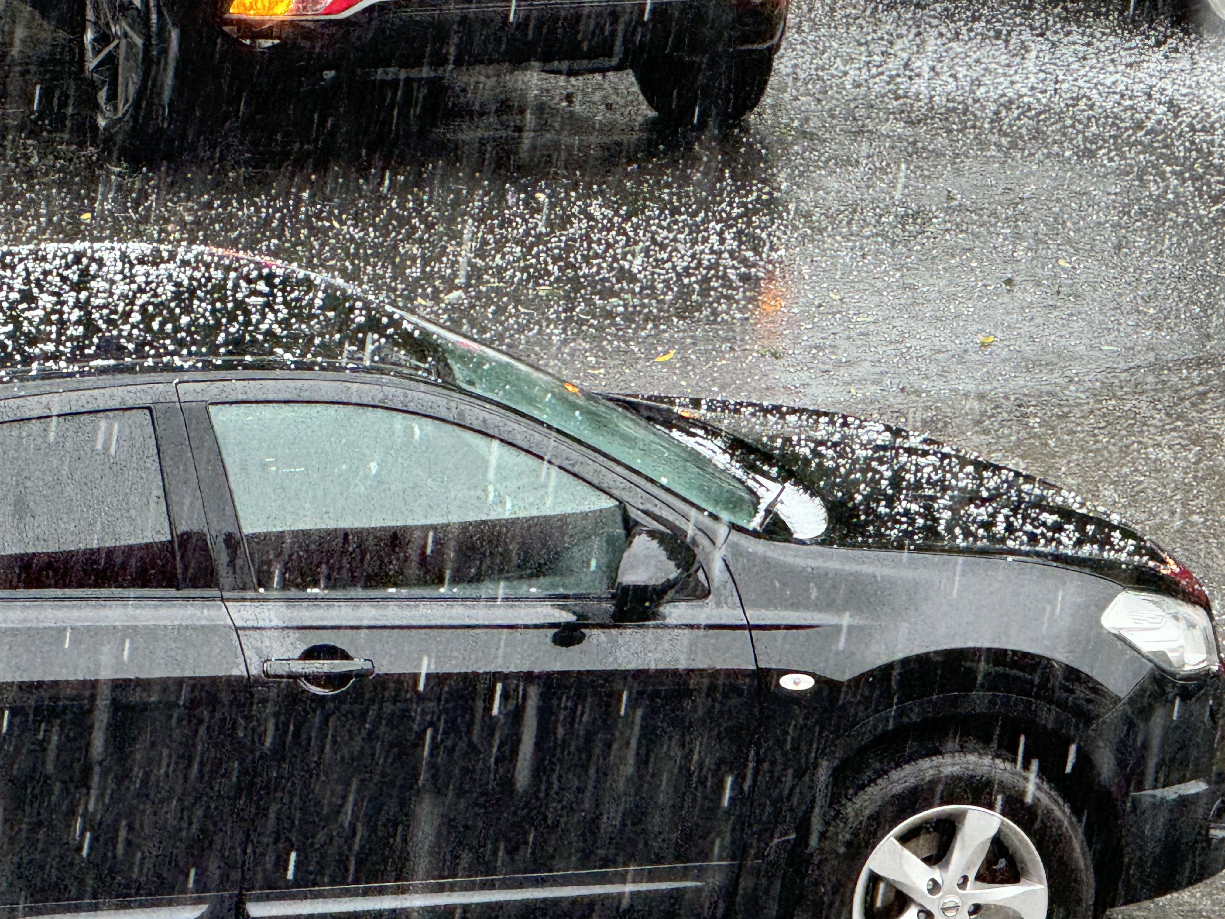 На момент публикации стихия в виде ливня с грозой бушует в центре города. Улицы заливает вода, а в окна машин и домов бьет жуткий, по мнению автора, град.