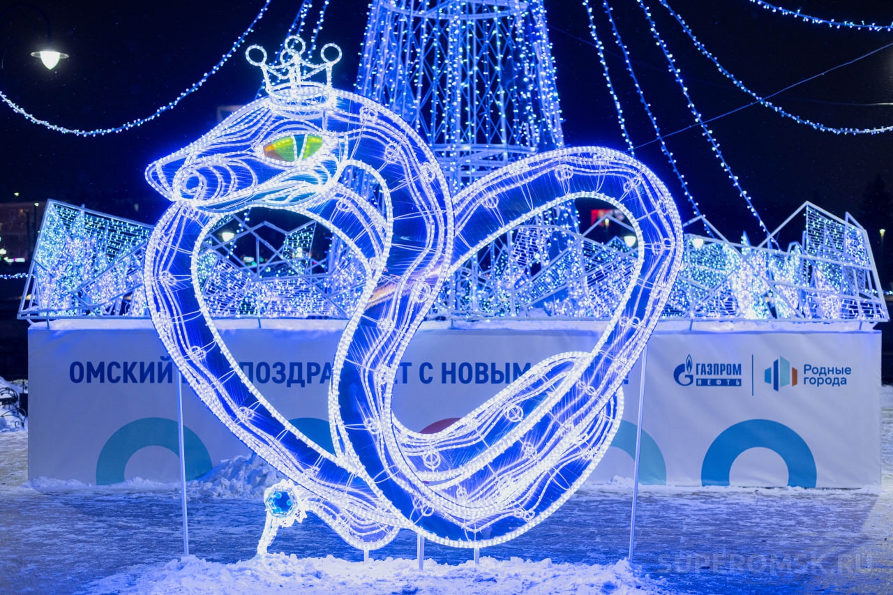 На Набережной Оми рядом с улицей Бударина появилась новогодняя 11-метровая праздничная ель, установлена световая инсталляция в форме змеи, символа наступающего 2025 года.