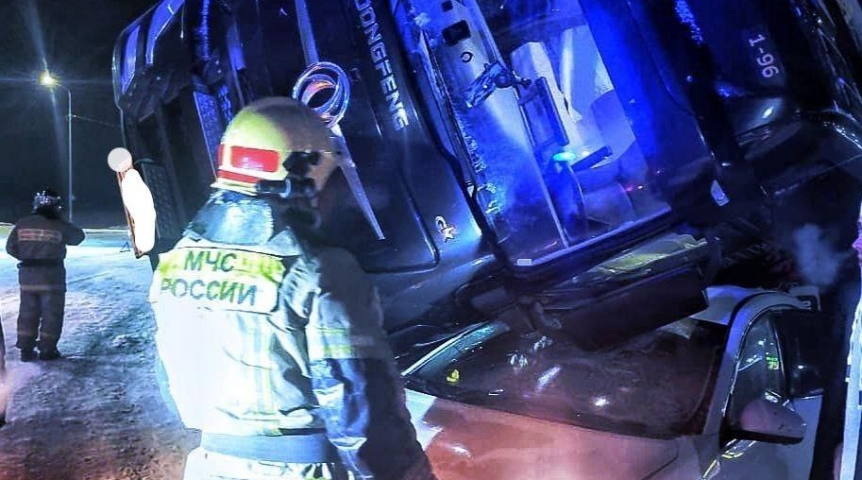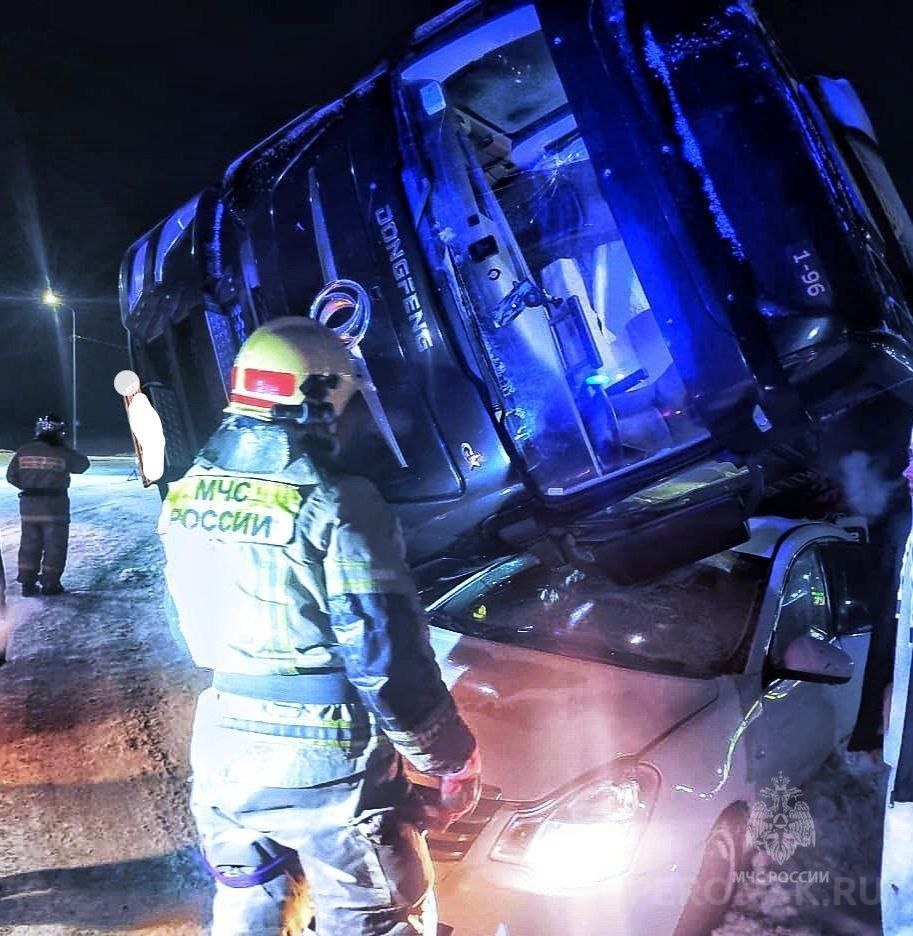 Предварительно там столкнулись фура и легковой автомобиль, в результате чего, судя по фото, большегруз «Донгфенг» опрокинулся на легковушку. Последствия ДТП ликвидировали четыре спасателя.
