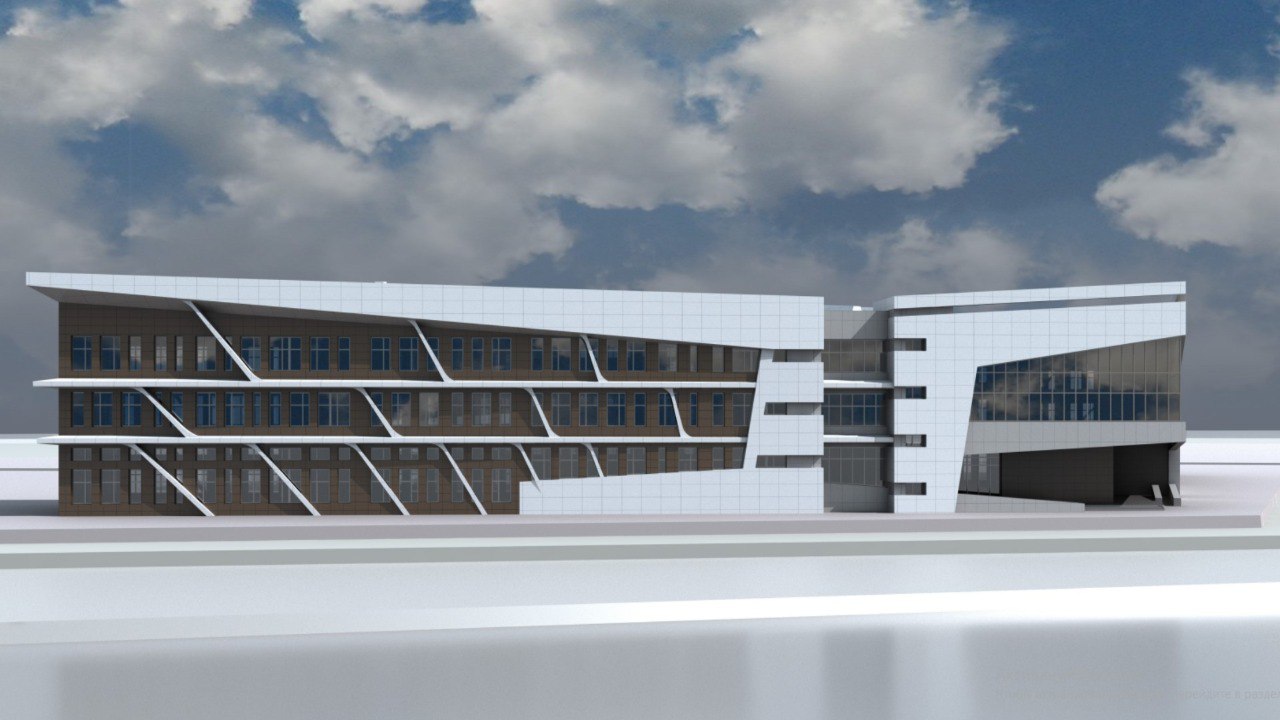 Как видно на эскизах, трехэтажное здание состоит из нескольких объединенных блоков и имеет сложную многоугольную форму.