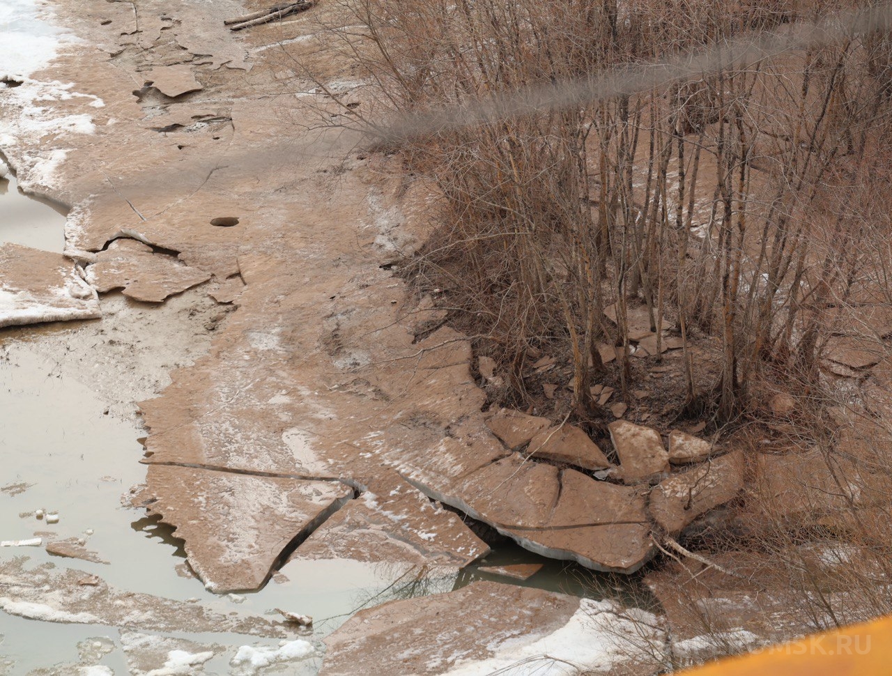 Как видно на кадрах с места, льдины на реке и весь берег Иртыша возле моста имени 60 лет ВЛКСМ скрылись под густым слоем взвеси, в итоге поверхность приобрела ржавый цвет. Можно предположить, что это произошло в результате работы пескоструйного аппарата в теле моста. Там рабочие, в частности, очищают металлические конструкции от образовавшегося за долгое время налета.