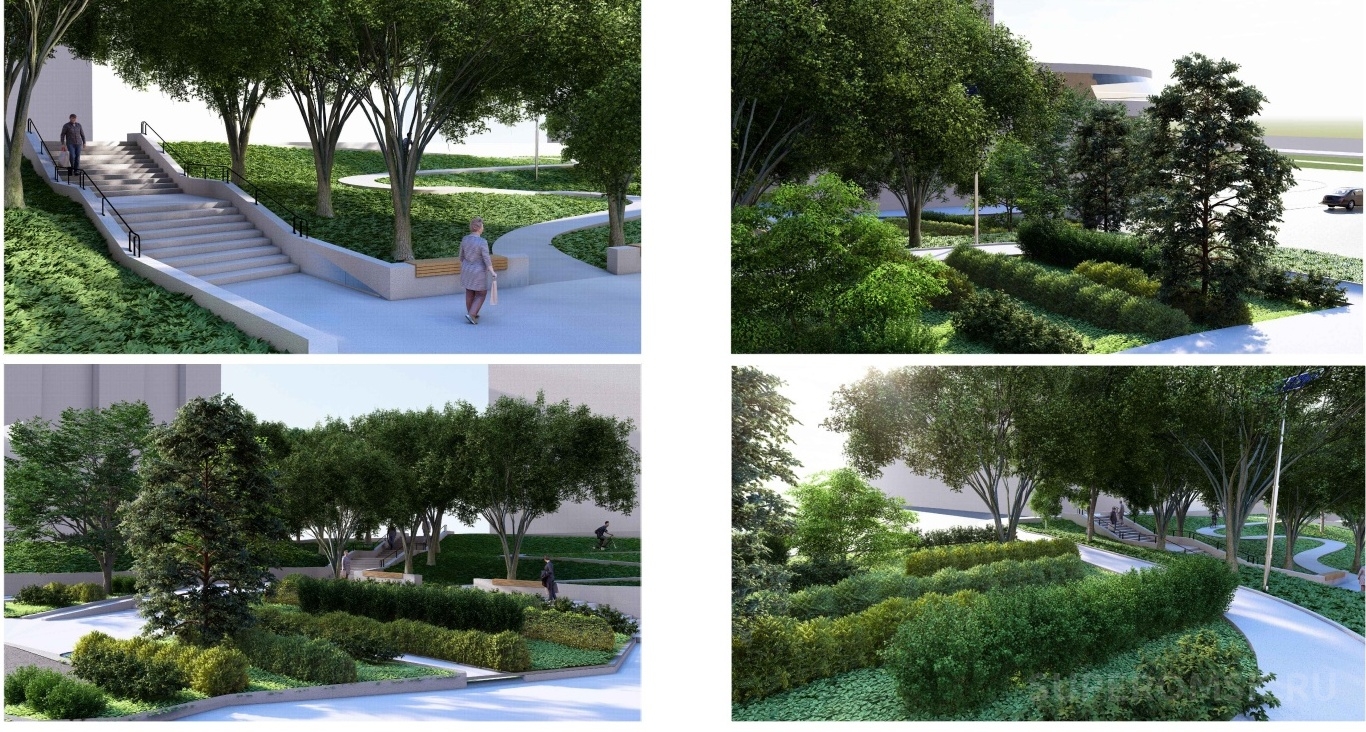 Пространство облагородят, замостив пешеходное пространство гранитными плитами и тротуарной плиткой. Также предполагается обновление ступеней лестницы, ведущей к Иртышу, панелями из гранита определенного происхождения – из Мансуровского месторождения. Наконец запланировано озеленение, включающее в себя высадку кустарников – кизильника, спиреи японской, будры плющевидной, девичьего винограда и пузыреплодника, в том числе вдоль лестничных маршей.