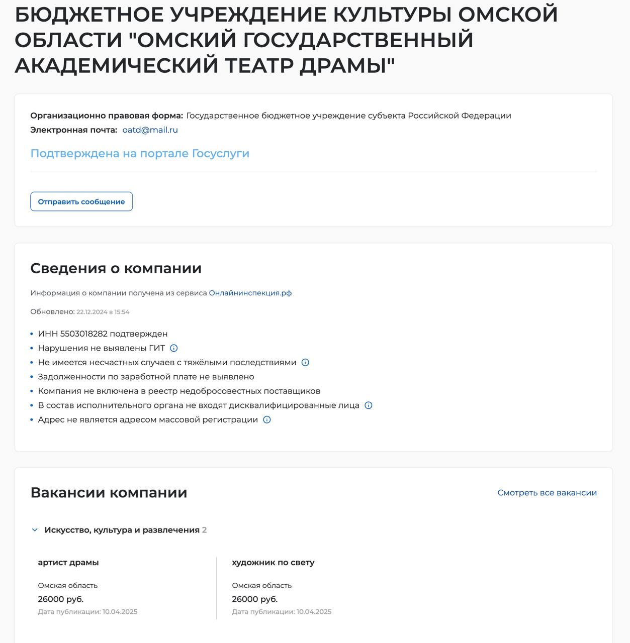 В Омском драматическом театре «Галерка» в 2025 году размещались вакансии слесаря-электрика по ремонту электрооборудования (30 тысяч рублей) и художника-гримера (до 40 тысяч рублей), в 2024 году искали дизайнера (до 45 тысяч рублей) и столяра для изготовления декораций (40 тысяч рублей). Напомним, у директора зафиксирована в среднем зарплата в 217,6 тысячи рублей, то есть с минимальным разрывом в 4,8 раза.