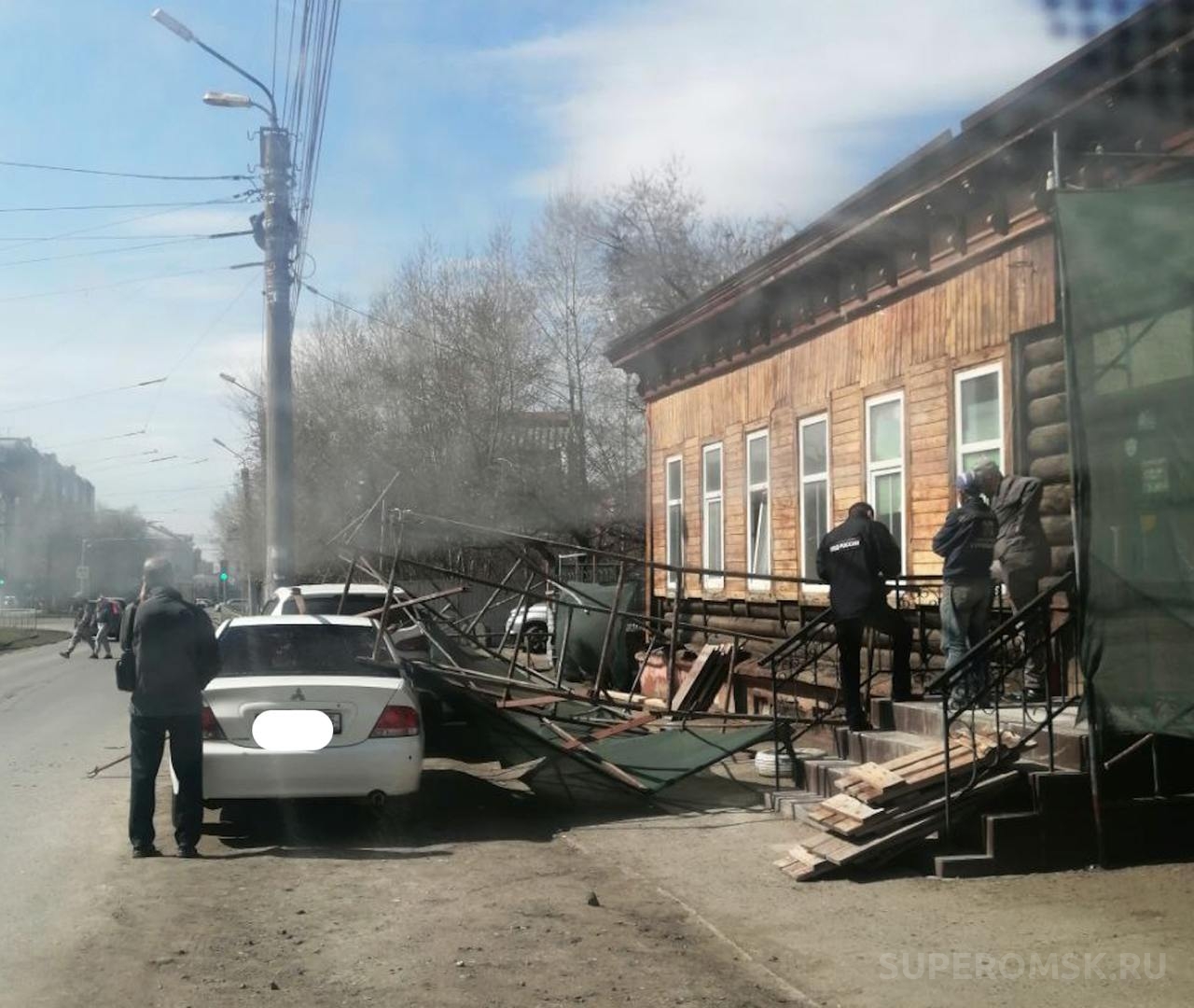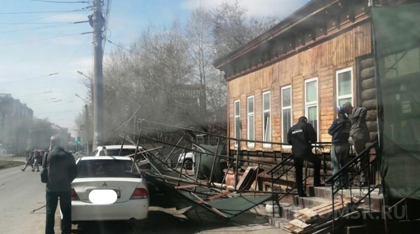 В среду, 16 апреля 2025 года, в центре Омска произошло небольшое ЧП. На тротуар по улице Лермонтова обрушились строительные леса. Как видно на фото, они рухнули также на припаркованные машины, повредив их. На снимке можно заметить рабочих и полицию.