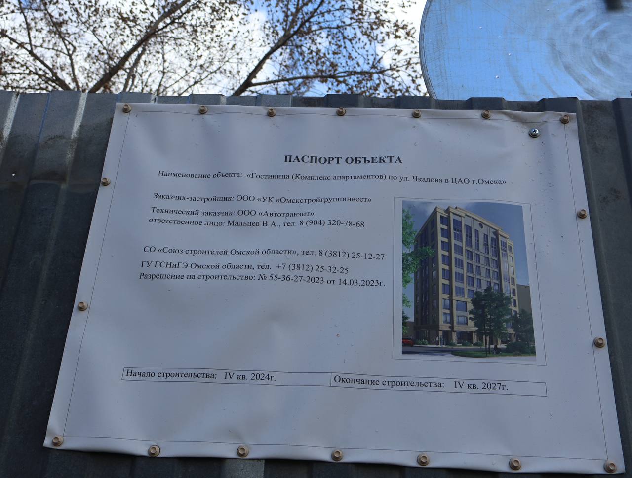 Паспорт объекта, с которым ознакомился «СуперОмск», гласит, что здесь появится девятиэтажная гостиница в виде комплекса апартаментов. Техническим заказчиком указано ООО «Автотранзит», а заказчиком-застройщиком – ООО «УК «Омскстройгруппинвест». Строительство планируют закончить в конце 2027 года.