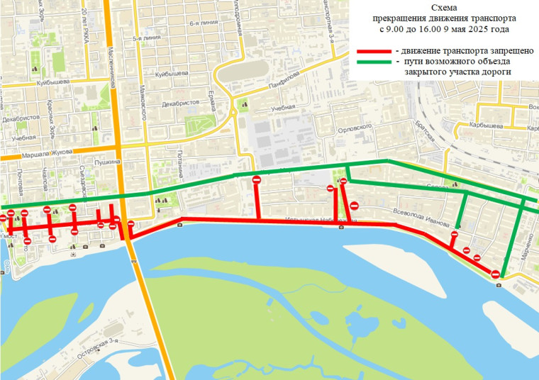 Также 9 мая при проведении театрального проекта «Путь России – путь Победы!» с 16 до 22 часов будут недоступны для движения: улица Ленина от Интернациональной до площади Победы включая Соборную площадь; Банковский переулок от Певцова до Соборной площади; улица Ивана Алексеева от Соборной площади до Красина; улица Тарская на участке от Ленина до Красина.