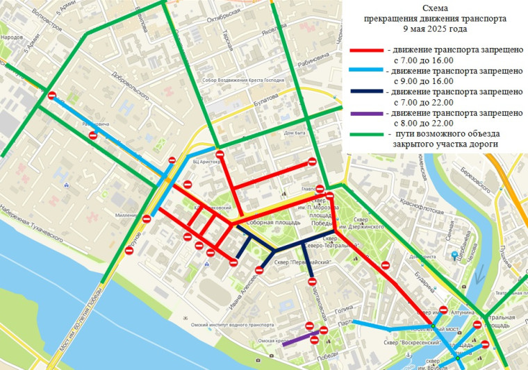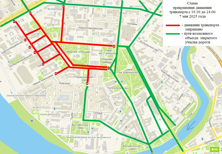 В праздничный день, 9 мая, для торжественного прохождения войск Омского гарнизона с 7 до до 16 часов для проезда будут закрыты: