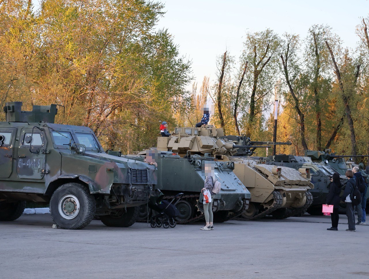 На автомобильной парковке, поодаль от основных экспонатов вниманию посетителей представлены отечественные бронемашины и единицы украинского и американского производства.