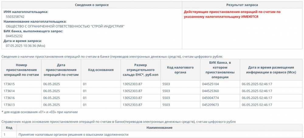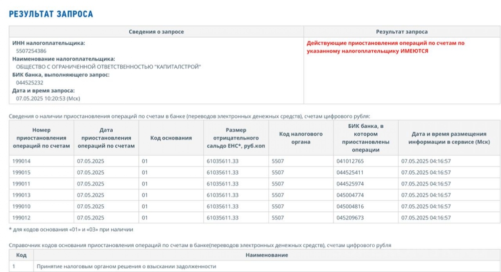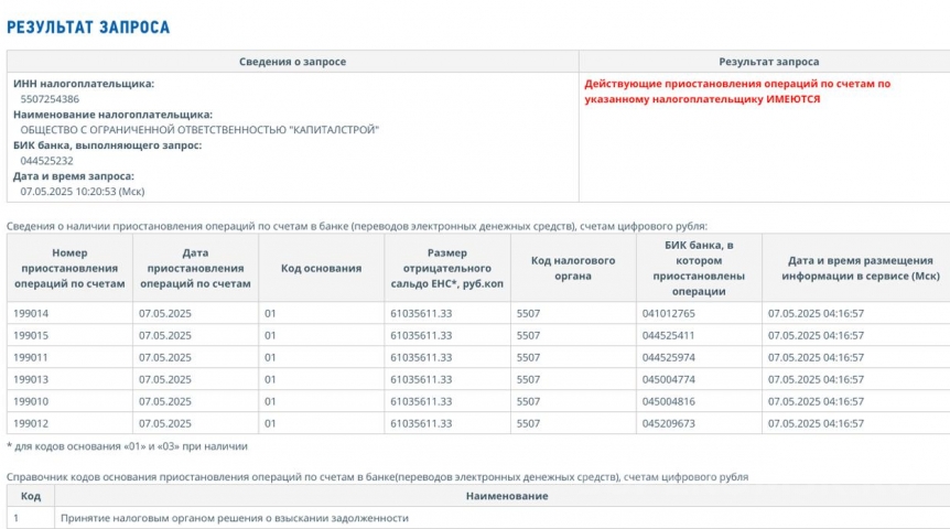 По состоянию на среду, 7 мая 2025 года, принято решение о блокировке счетов ООО «Капиталстрой» Евгения Кормильца и Виталия Штукерта. Как следует из выписки, имеющейся в распоряжении «СуперОмска», в качестве обоснования таких мер по 6 счетам фигурирует «принятие налоговым органом решения о взыскании задолженности». Сумма отрицательного сальдо на указанную дату превышает 61 миллион рублей.