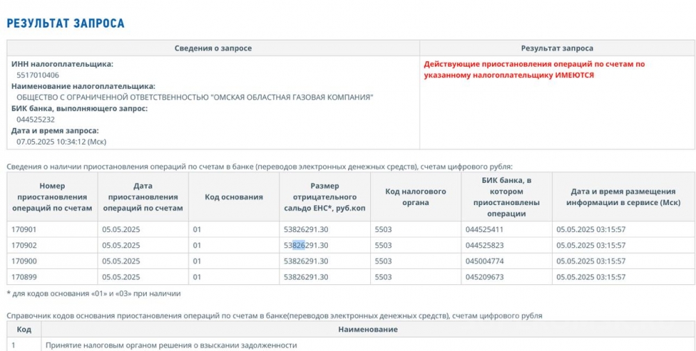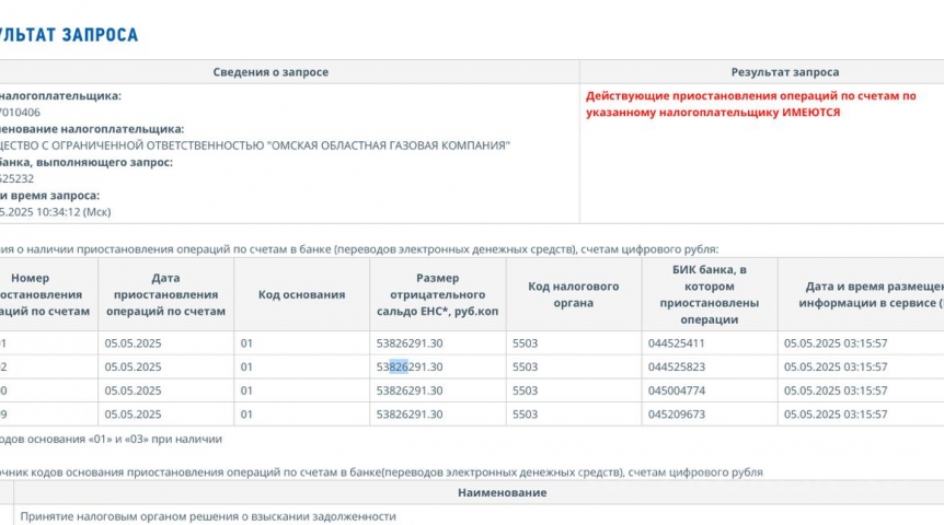 Кроме того, с 5 мая 2025 года действует приостановка операций на счетах ООО «Омская областная газовая компания». «СуперОмск» сообщал о таких мерах ранее, однако стоит отметить, что сумма отрицательного сальдо на заблокированных счетах выросла – до порядка 53,8 миллиона рублей. Напомним, компания также относится к числу крупных работодателей региона со среднесписочной численностью сотрудников в 265 человек.