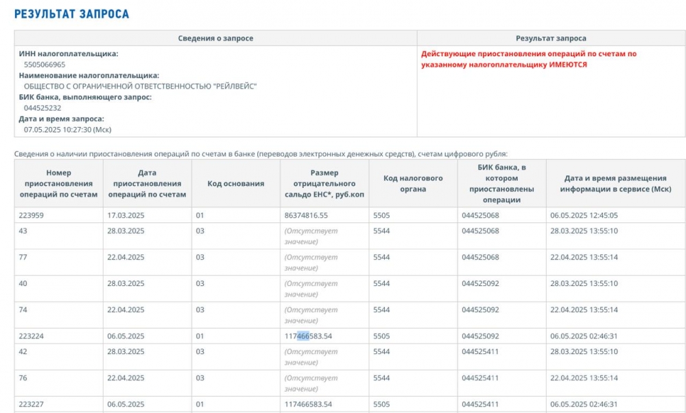 Стоит отметить, что аналогичные меры, по наблюдениям «СуперОмска», с наступлением последнего весеннего месяца введены в отношении еще одной компании из строительной отрасли. Так, согласно выписке ФНС, решением от 6 мая 2025 года приостановлены операции по счетам ООО «Рейлвейс» Алексея Тересова, основным видом деятельности которого значится «строительство железных дорог и метро». Заявленный размер отрицательного сальдо – свыше 117 миллионов рублей. При этом в финансовой отчетности фирмы за 2024 года фигурирует объем выручки в 803,4 миллиона рублей, а также резкий «взлет» среднесписочной численности сотрудников с 44 в 2023 году до 249 к концу 2024-го.