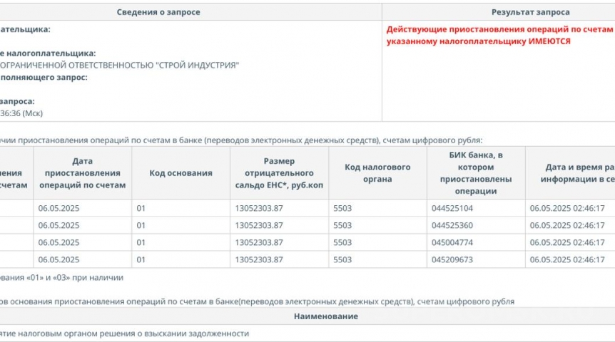 Как обратил внимание «СуперОмск», в начале мая 2025 года ФНС России запросила блокировку счетов для четырех крупных омских стройфирм, чья общая среднесписочная численность сотрудников составляет более 800 человек. Общая сумма превышает 200 млн рублей.