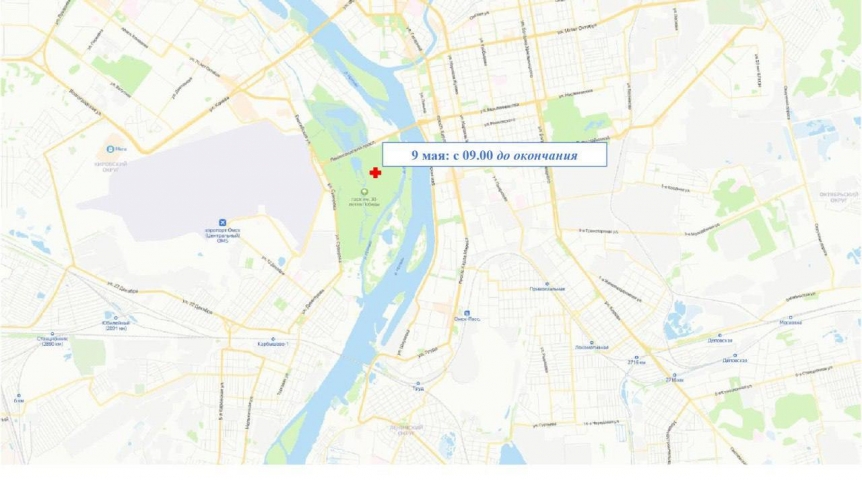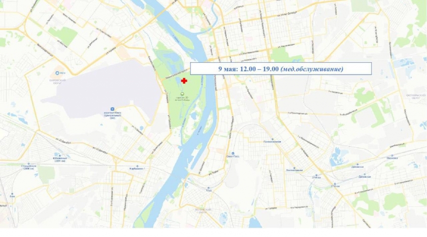 Торжественное построение войск на Соборной площади – три машины скорой помощи расположены у здания Омского Епархиального управления (пересечение ул. Интернациональной и ул. Орджоникидзе), у Законодательного собрания Омской области (ул. Красный Путь, 1) и у прокуратуры Омской области (пересечение ул. Ленина и Тарской). Также на трибунах для почетных гостей будут находиться два медика из Госпиталя ветеранов войн.