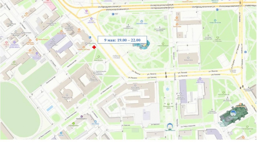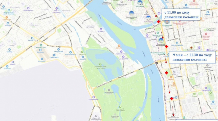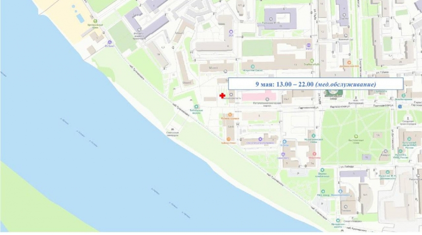 Шествие «Бессмертный полк» – с 9:00 по маршруту следования колонн будут работать 4 бригады СМП: у библиотеки имени Пушкина (ул. Красный Путь, 11), на пересечении ул. Ленина и ул. Щербанева у Юбилейного моста, у дома на Ленинградской площади, 2 (ул. Ленина, 44) и на бульваре Победы.