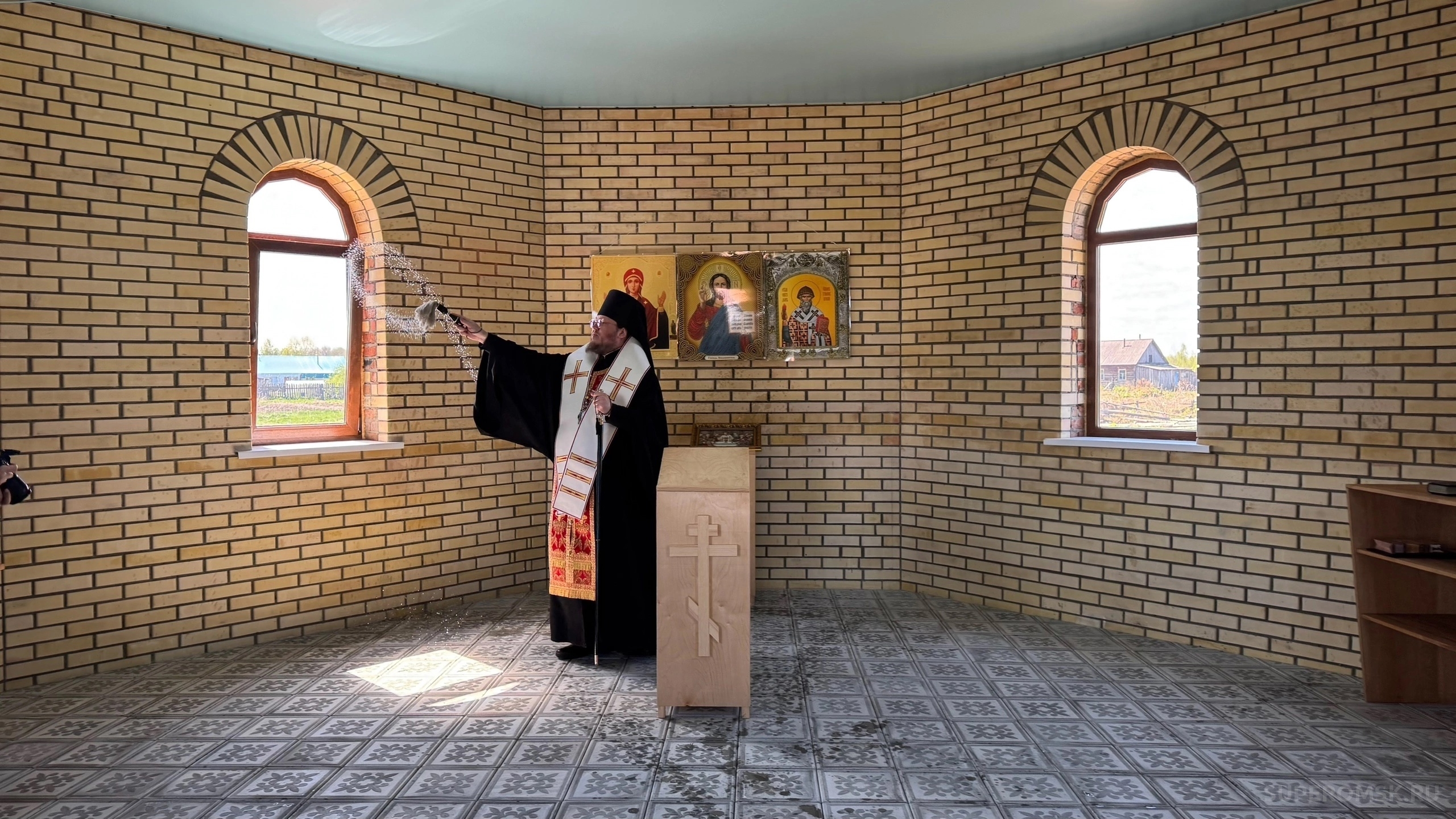Как можно заметить на фото, внутри храм выложен светлым кирпичом, полы устланы светло-серой плиткой с узором, напоминающим цветочный. Имя настоятеля нового храма, которого благословил епископ Тарский и Тюкалинский Викентий в публикации не раскрывается.