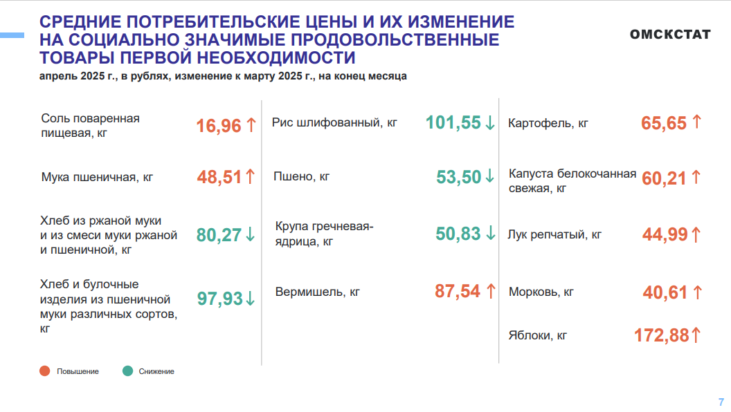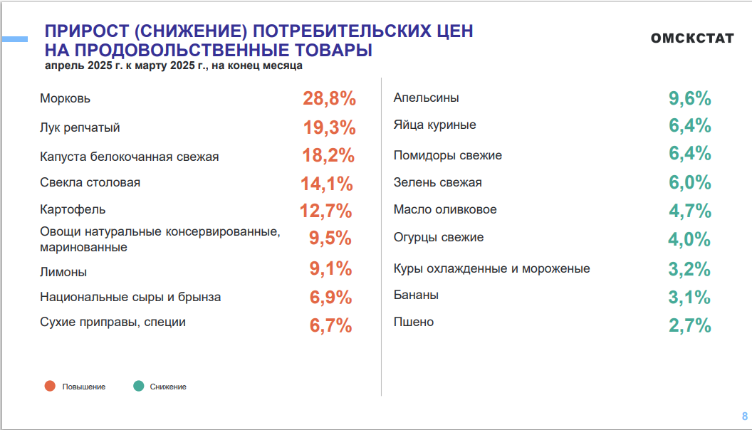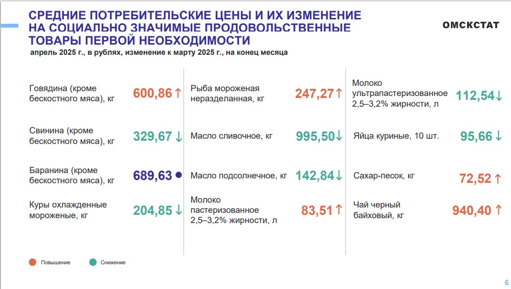 Специалисты Омскстата проанализировали изменение цен на потребительском рынке Омской области в апреле 2025 года и выяснили, что продукты стали дороже в среднем на 0,8 % в сравнении с мартом.