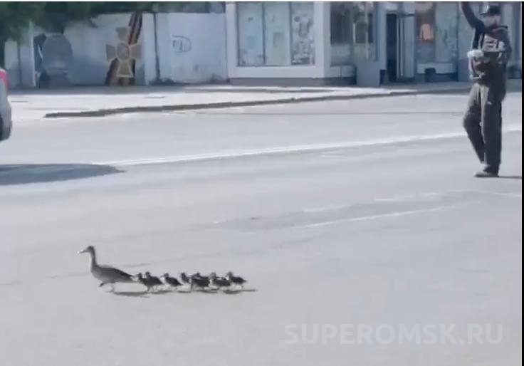 Птицам помог перейти оживленную проезжую часть один из омичей, который перегородил собой дорогу автомобилям.