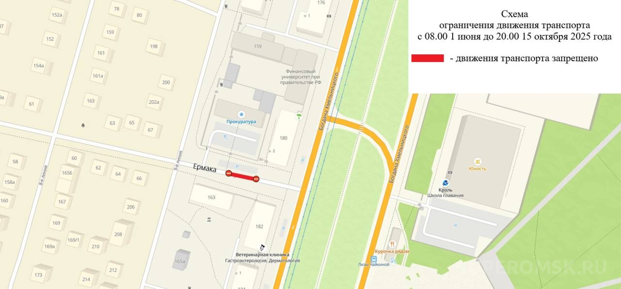 «Для проведения ремонтных работ на подземных инженерных коммуникациях тепловых сетей будет прекращено движение транспортных средств с 8:00 часов 1 июня до 20:00 часов 15 октября по улице Ермака, на участке дороги от жилого дома № 182 по улице Богдана Хмельницкого до жилого дома № 163 по улице 9-й линии», – говорится в сообщении омского дептранса.