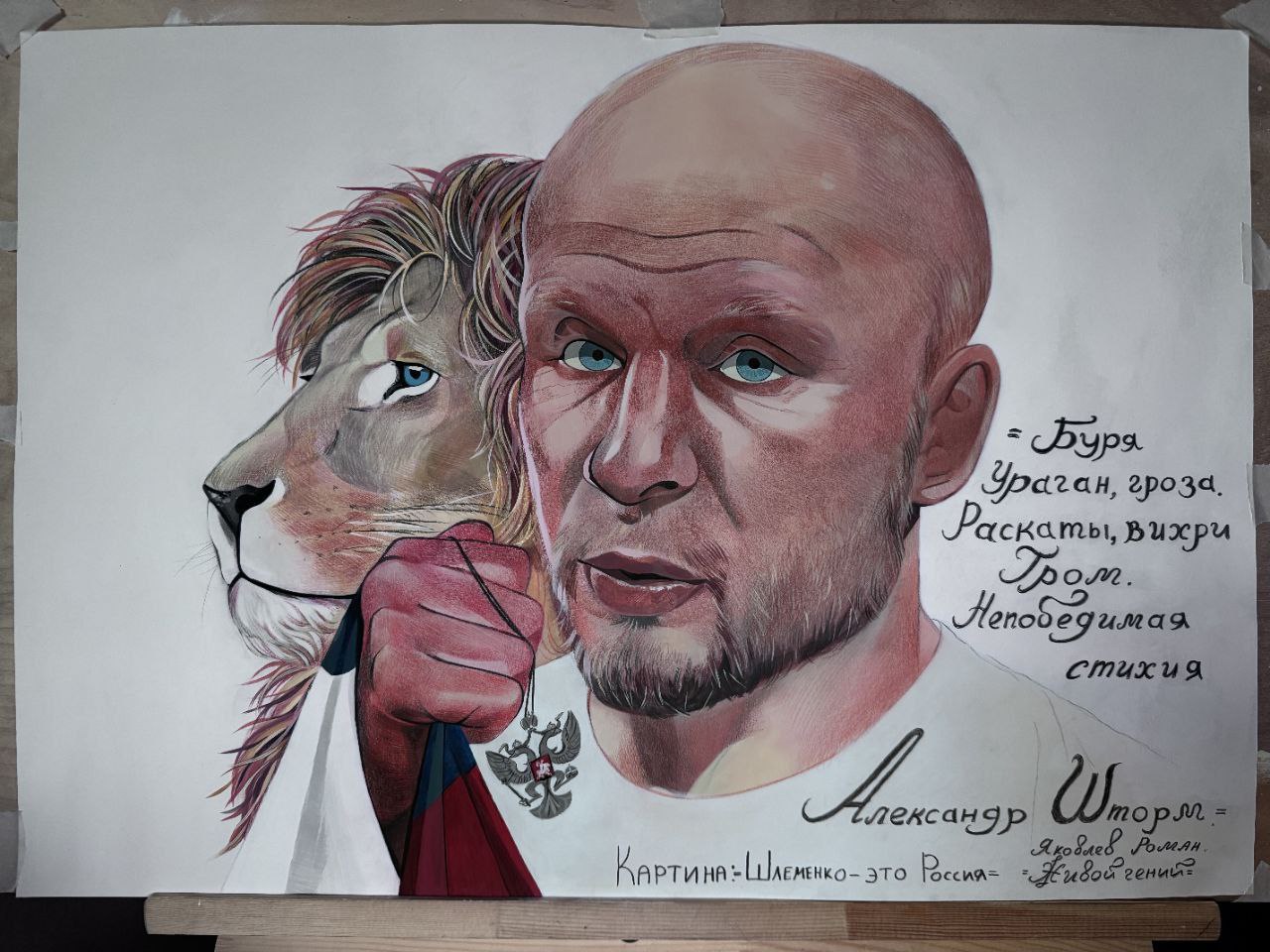 Отметим, что на картине изображены портрет Шлеменко с рукой, сжатой в кулак, и львиная голова.