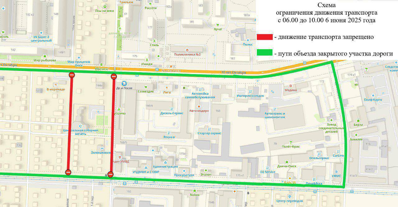 В Омске в пятницу, 6 июня 2025 года, для организованного проведения праздничного богослужения, посвященного празднику Курбан-байрам, перекроют движение всех видов транспорта по 19-й и 20-й линии на участке от улицы Лермонтова до улицы 10 лет Октября. Как сообщили в пресс-центре омской мэрии, проезд на участках, отмеченных на схеме, будет закрыт с 6 до 10 часов утра.