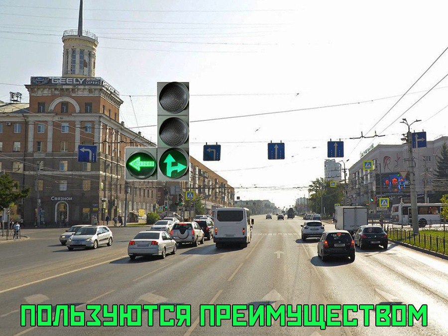 При этом поворот направо со стороны улицы Пушкина будет осуществляться в одной фазе с транспортом, который поворачивает налево со стороны улицы Ленина. Напомним, что в соответствии с ПДД транспортные средства, выполняющие поворот налево, пользуются преимущественным правом проезда, правило «помехи справа» в данном случае не действует.
