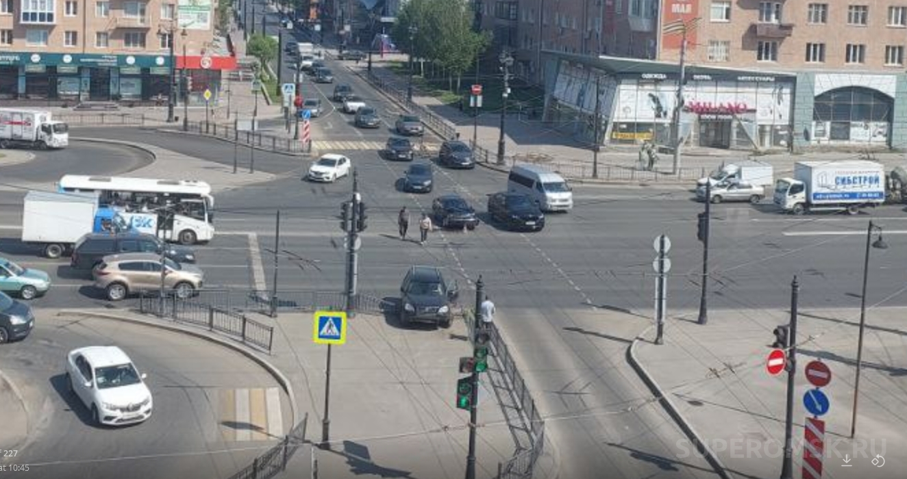 После удара машина, ехавшая от проспекта Маркса, осталась стоять посреди перекрестка с разбитой передней частью, второй автомобиль после аварии выехал на тротуар, поломав дорожное ограждение.