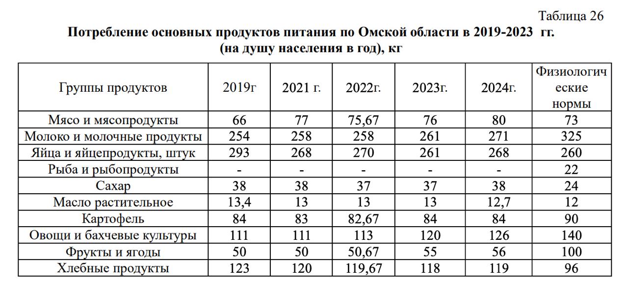 «Структура питания населения Омской области на протяжении 5 лет не изменилась и не улучшилась в отношении потребления продуктов питания, обеспечивающих потребности организма эссенциальными пищевыми веществами. Как и прежде, отмечается недостаток потребления в следующих группах продукции: молоко и молочные продукты – на 16,6 %, овощи и бахчевые культуры – на 10,0 % и фрукты на 44,0 %, картофель – на 6,7 %, отмечается избыток потребления сахара на 36,8 %, хлебных продуктов – на 19,3 %», – говорится в отчете.