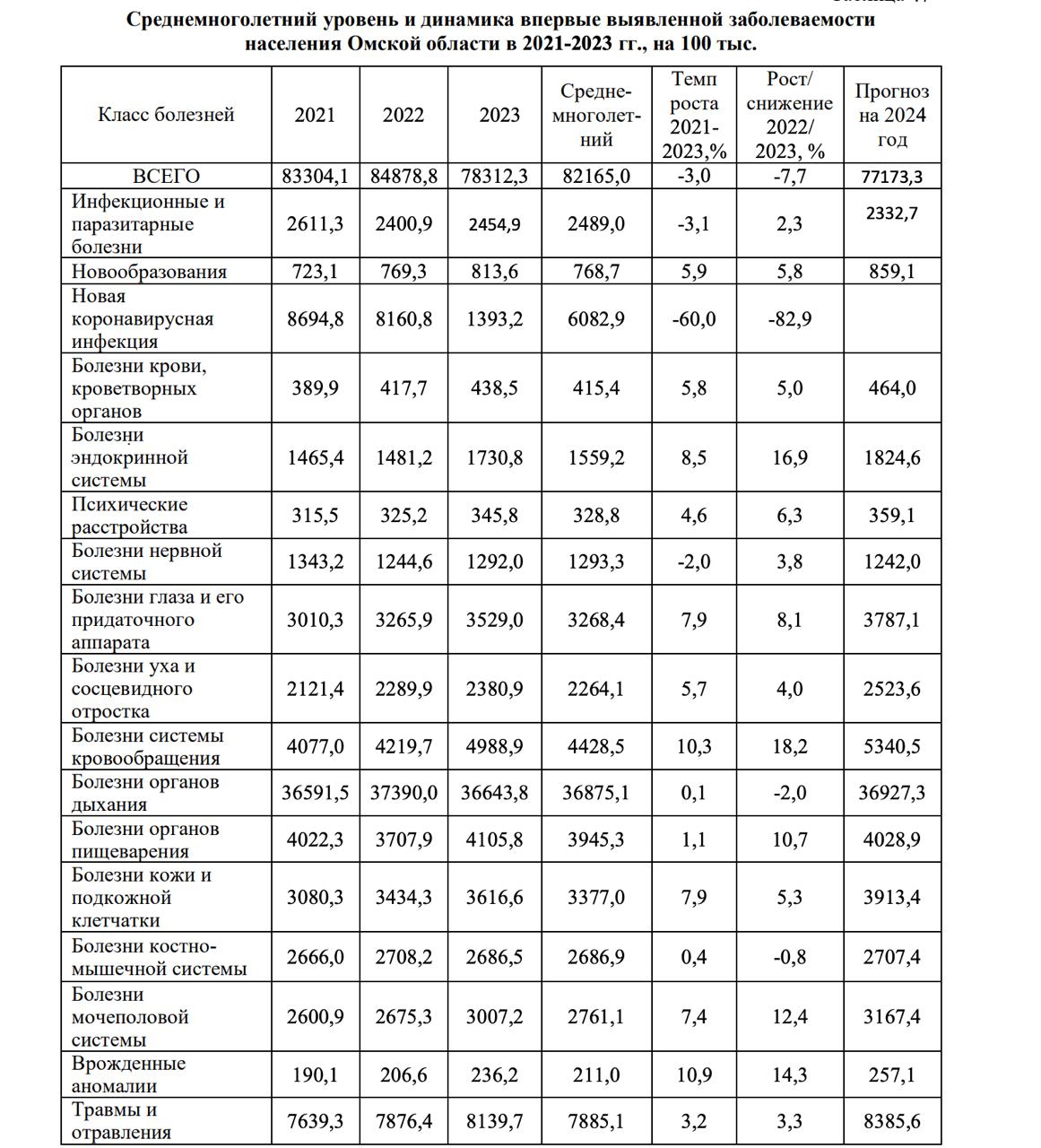 «За трехлетний период наблюдается тенденция к росту заболеваемости по всем классам болезней, за исключением инфекционных и паразитарных болезней и болезней нервной системы – по этим группам отмечается умеренная тенденция к снижению заболеваемости (ежегодный среднемноголетний Тсн. от -2,0 % до -3,1%). Выраженная тенденция к росту заболеваемости новообразованиями (Тпр. +5,9 %) болезнями крови, кроветворных органов (Тпр. +5,8 %), болезнями эндокринной системы (Тпр. +16,9 %), болезнями глаза (Тпр. +8,1 %), болезнями уха и сосцевидного отростка (Тпр. +5,7 %) болезнями системы кровообращения (Тпр. +10,3 %), болезнями кожи и подкожной клетчатки (Тпр. +7,9 %), болезнями мочеполовой системы (Тпр. +7,4 %), врожденными аномалиями (Тпр. +10,9 %)», – говорится в докладе.