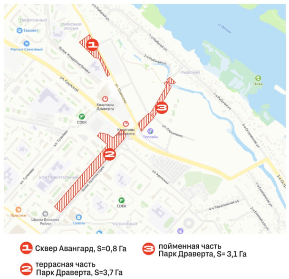 Почти 7 гектаров зеленых зон появится на территории Левого берега Омска. Как сообщили в Минстрое Омской области, началось оформление «Парка Драверта» по бульвару Архитекторов и сквера «Авангард» по улице Шаронова. В ведомстве представили карту расположения зеленых зон. Как видно, сквер значительно уступает в размерах парку.