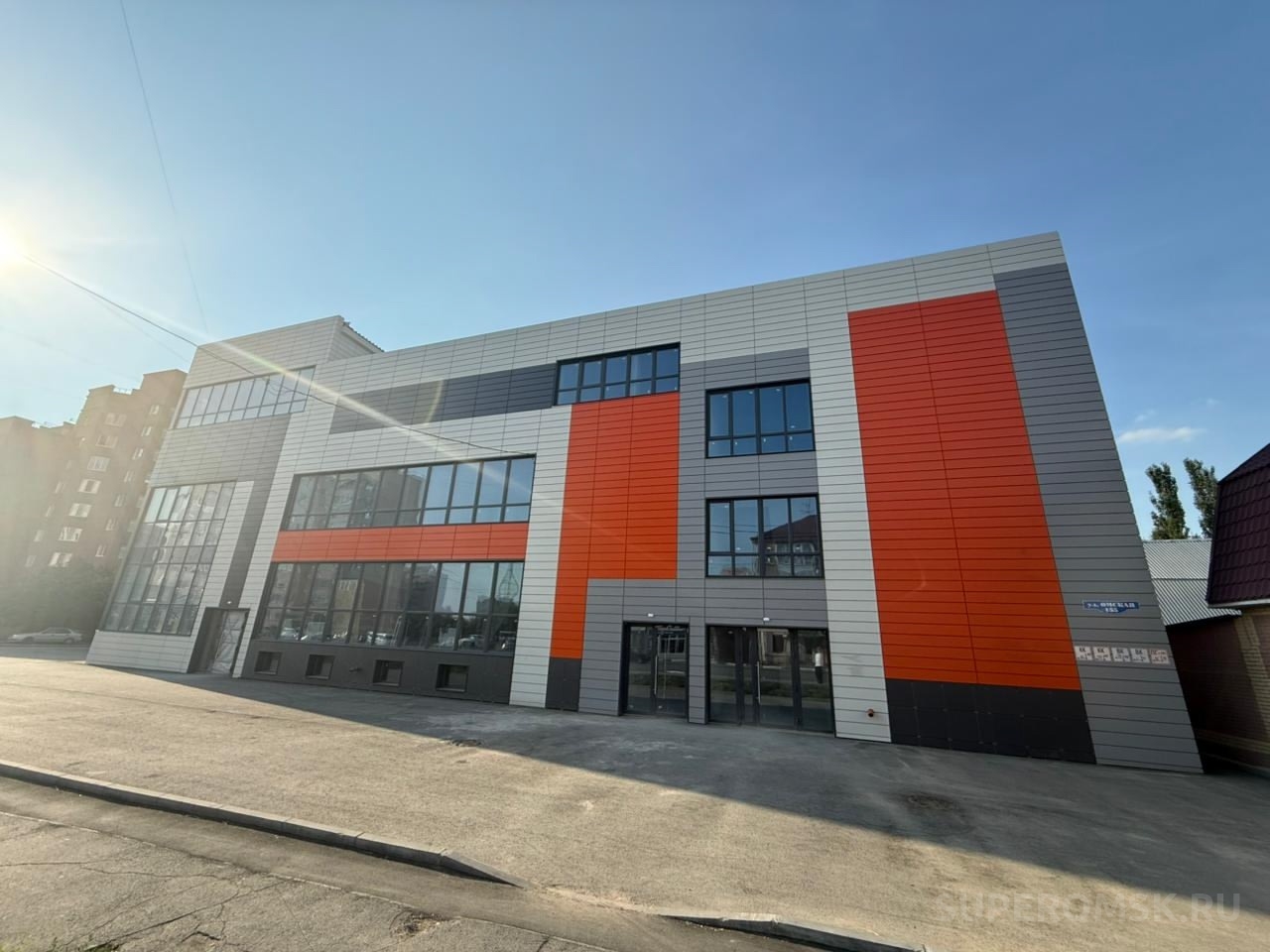 Как видно на фото, здание облицовано плиткой в бежевом, сером и оранжевом цветах, а также имеет затемненные окна.