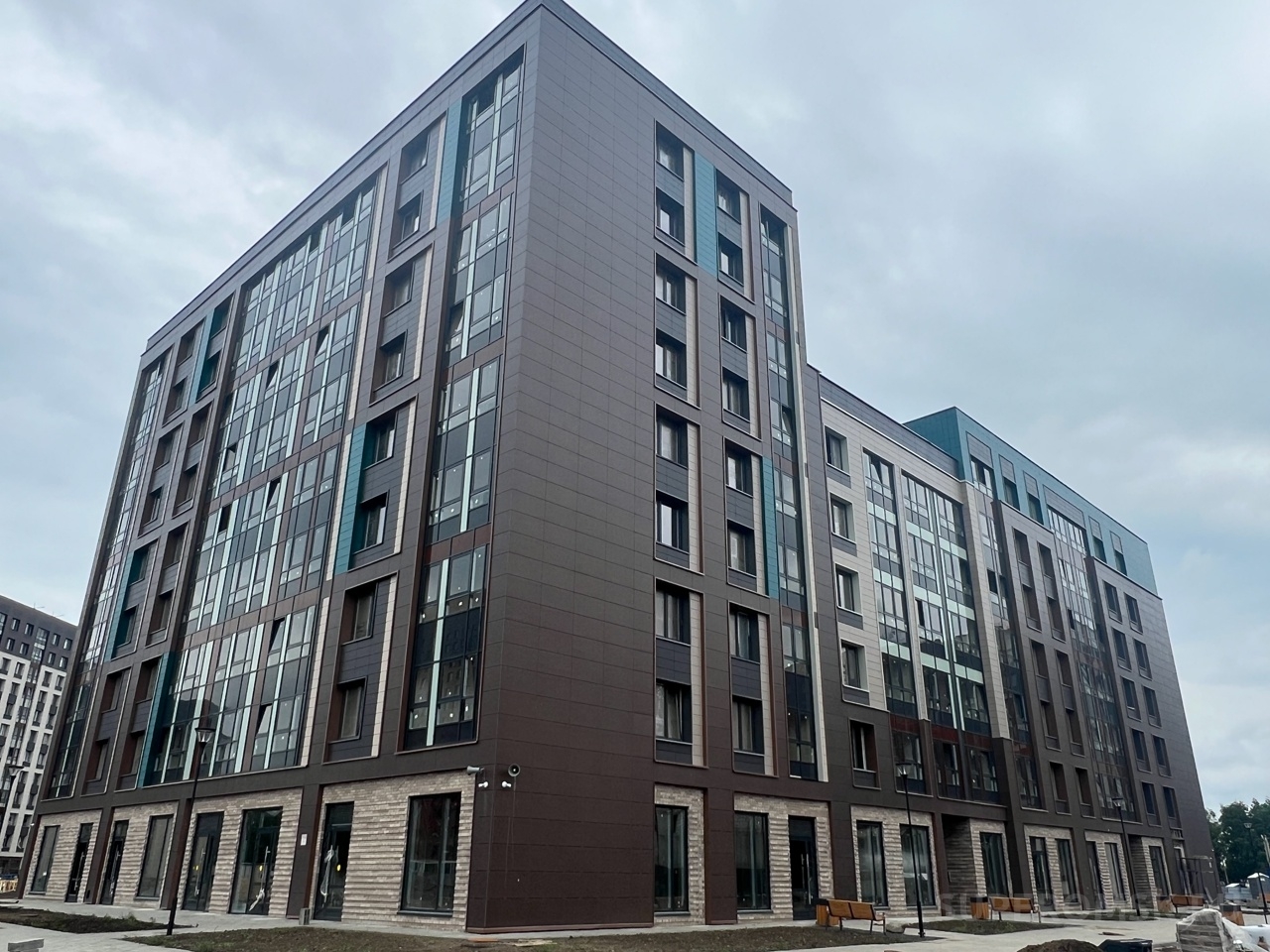 Как видно на фото, новостройка выполнена в коричневом цвете с элементами бежевого и синего.