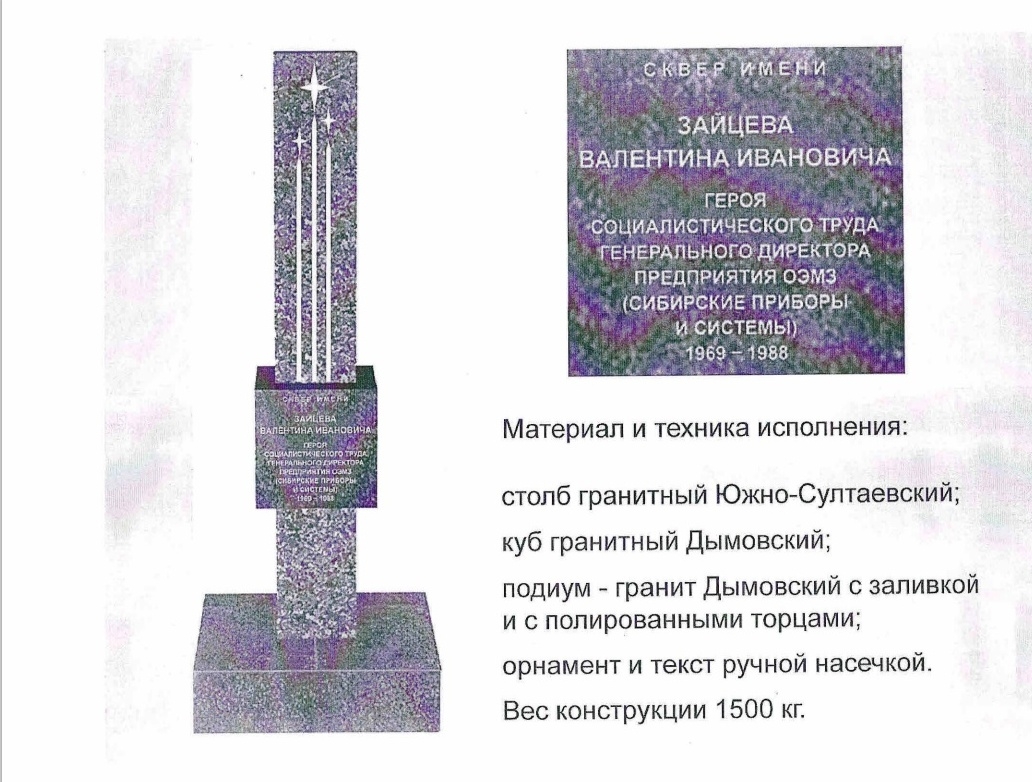 Согласно проекту, вынесенному на обсуждение депутатов, речь идет об установке гранитного столба, по центру которого разместится куб с выгравированным текстом «Сквер имени Зайцева Валентина Ивановича, героя социалистического труда, генерального директора предприятия ОЭМЗ (Сибирские приборы и системы) 1969–1988».