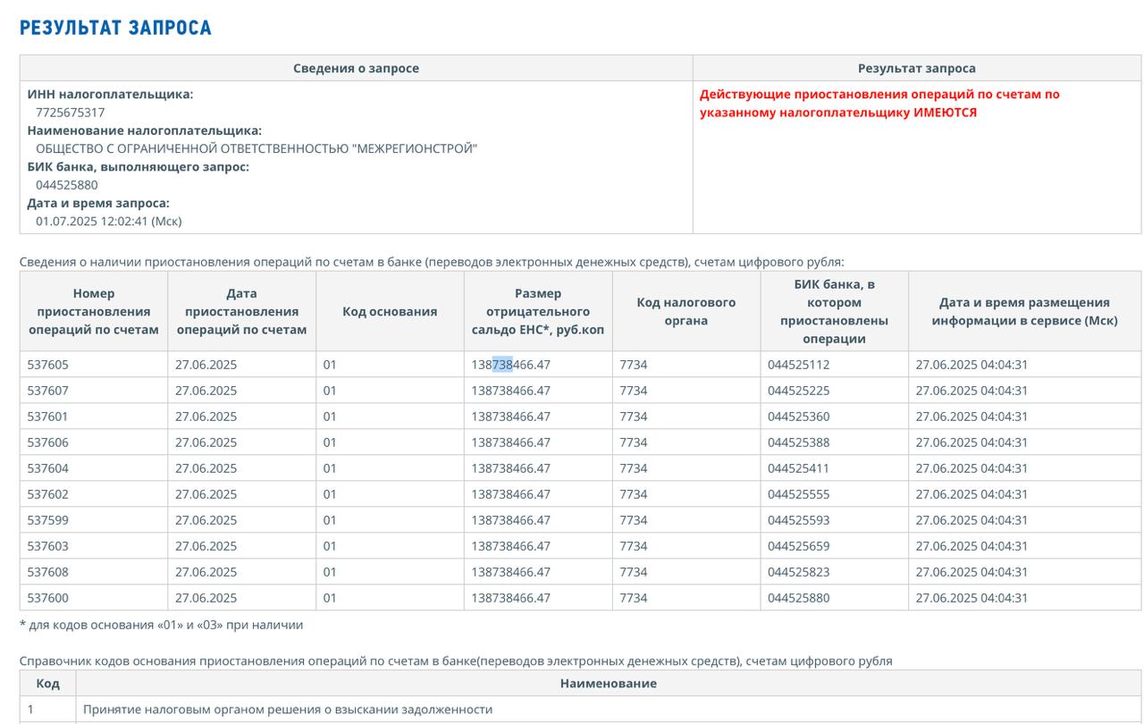 Согласно выписке «СуперОмска» из ФНС от 1 июля 2025 года, в отношении московского ООО «Межрегионстрой» запрошено приостановление операции по счетам. Согласно ответу, речь идет о сумме порядка 138,7 млн рублей, заявленных как размер отрицательного сальдо в категории «принятие налоговым органом решения о взыскании задолженности» (на фото ниже).