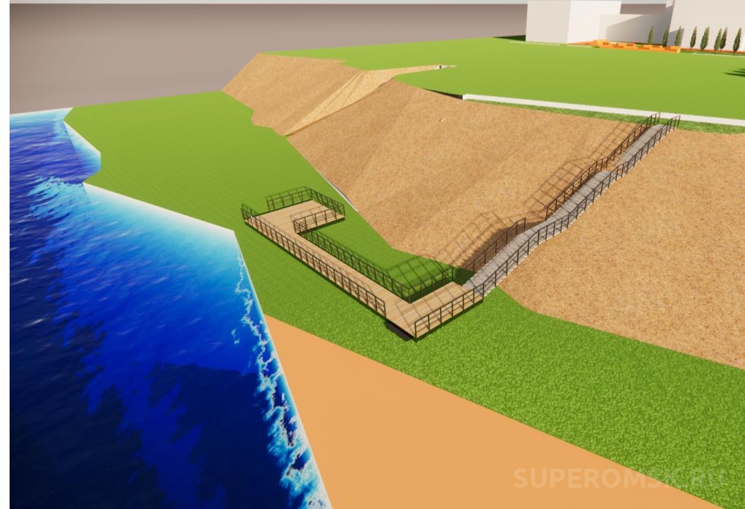 В частности, на территории оборудуют удобную и крепкую лестницу-спуск к водоему из железобетонных плит. Также подрядчику предстоит смонтировать площадки из деревянного настила, проложить дорожки из тротуарной плитки, установить три парковые скамьи с навесом и ограждения. Кроме того, в договор включена засыпка территории песком. Схематичный вид нового пляжа представлен на фото.
