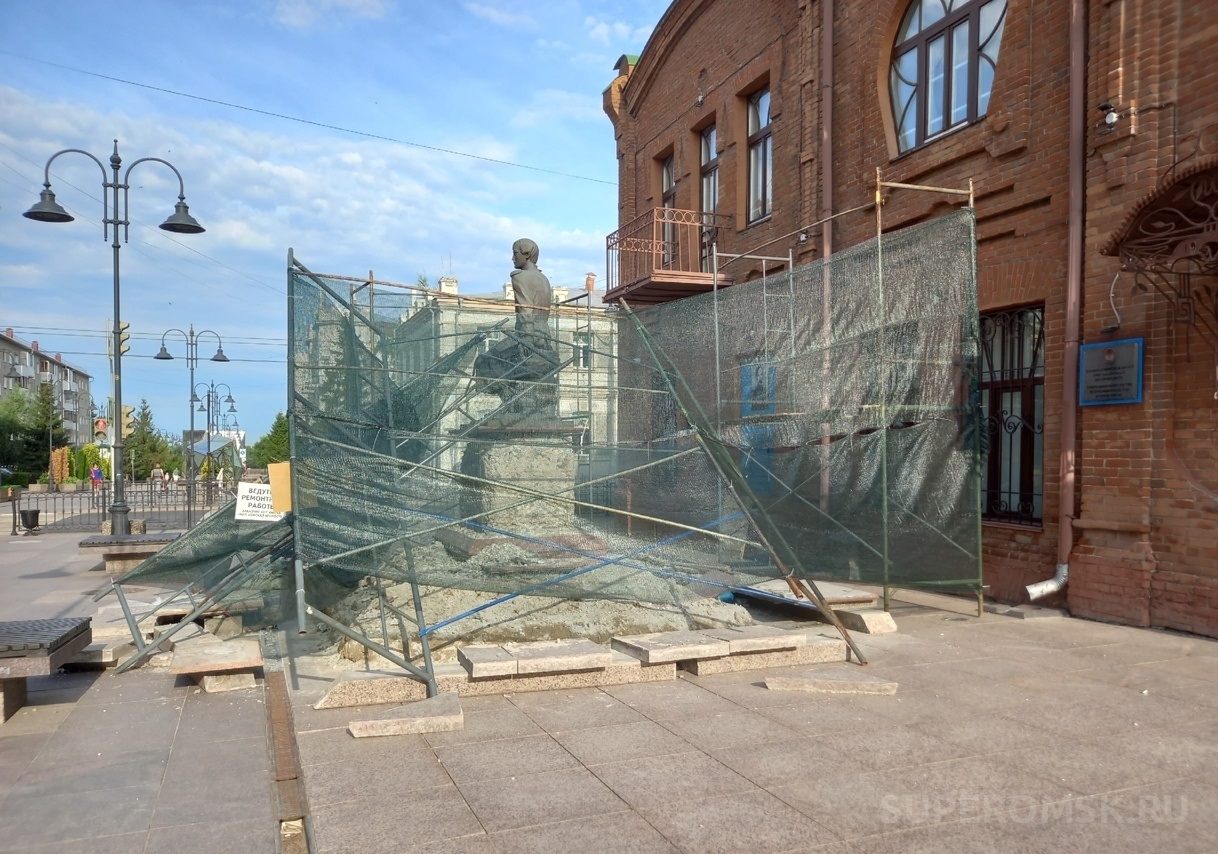Как видно на фото, памятник огородили для проведения ремонтных работ. Здесь же размещена предупредительная надпись о ремонтных работах, где указано, что их заказчиком является автономное учреждение города Омска «Музей – исторический парк «Омская крепость».