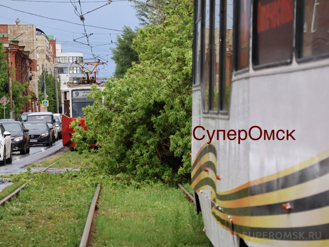 По данным «СуперОмска», трамвайные пути на этом участке «перегородило» снесенное ураганом дерево.