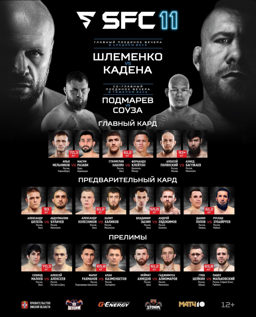Сегодня же свою форму показали чемпион мира по ММА Александр «Шторм» Шлеменко, его соперник – чемпион организации «Ночной бой возмездия», испанец бразильского происхождения Гильерме «Воин» Кадена, бойцы команды STORM Shlemenko Fight Team Александр Подмарев и Станислав Набоян, а также участник главного карда, бразилец Фернандо Клейтон Сильва Де Сoуза.