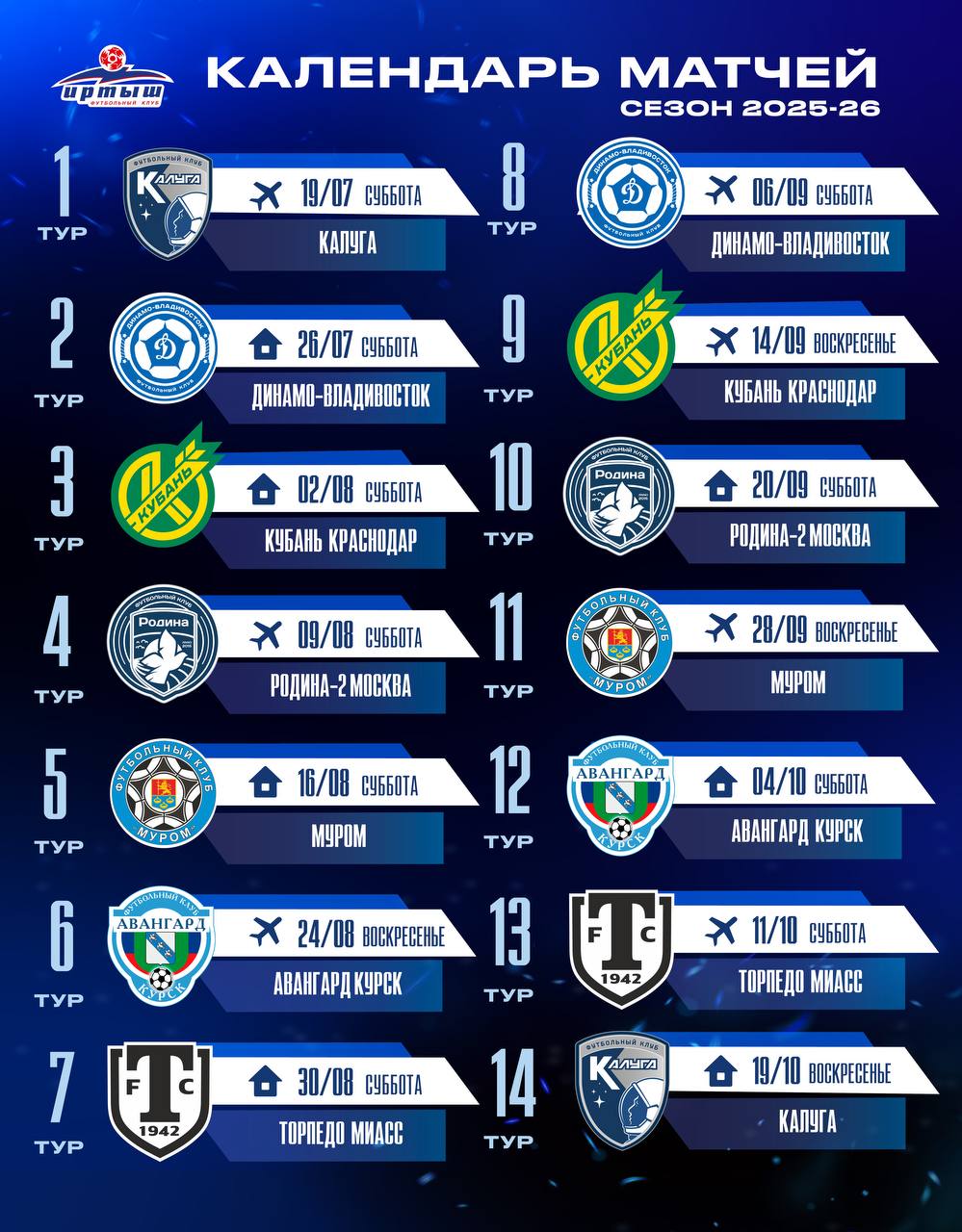 Омский футбольный клуб «Иртыш» представил календарь матчей на новый сезон. До 19 октября 2025 года команде предстоит провести в общей сложности 14 игр, один из матчей уже прошел 19 июля.