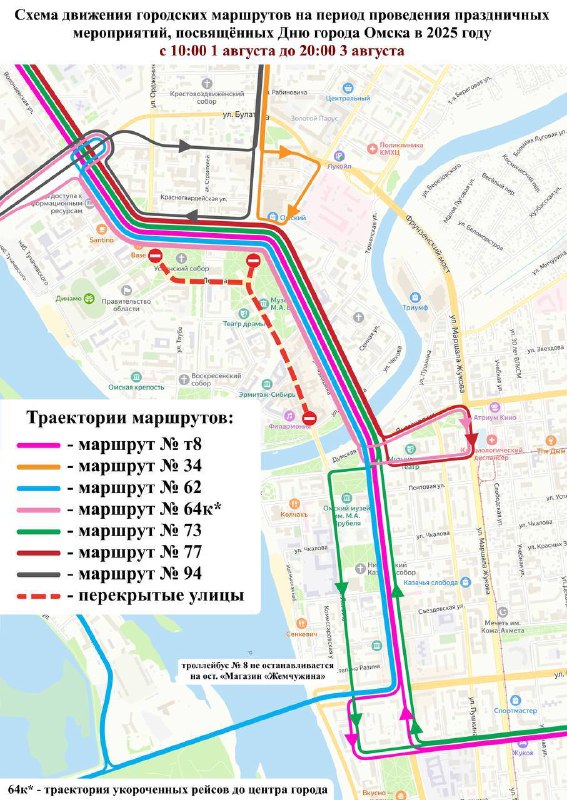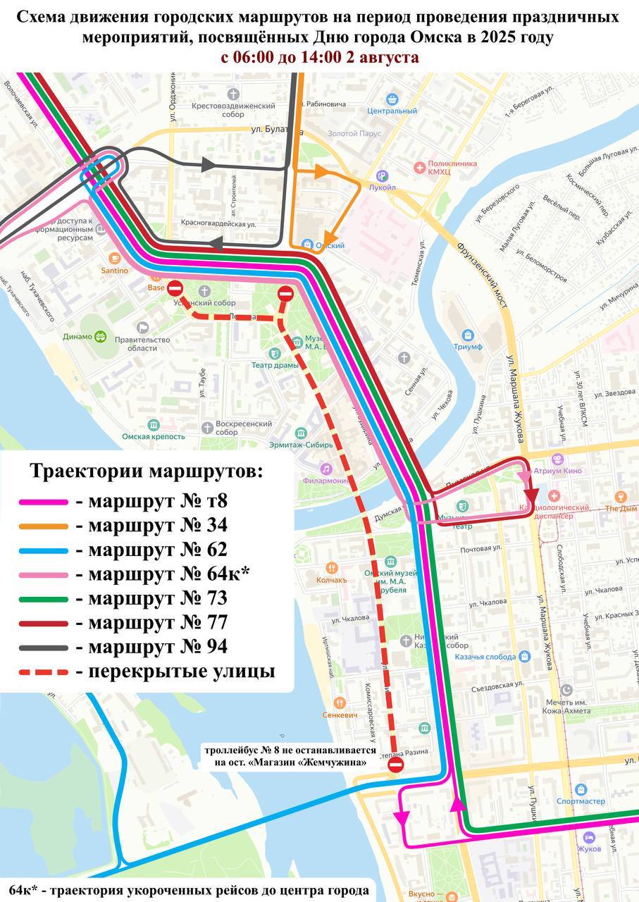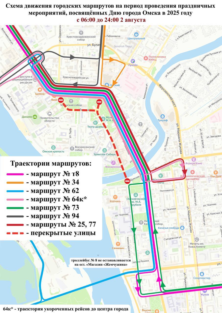 Мэрия Омска сообщила во вторник, 29 июля 2025 года, что в связи с подготовкой ко Дню города и Дню Омской области с 1 по 3 августа 2025 года будет изменена схема движения автобусов и троллейбусов в центре города.