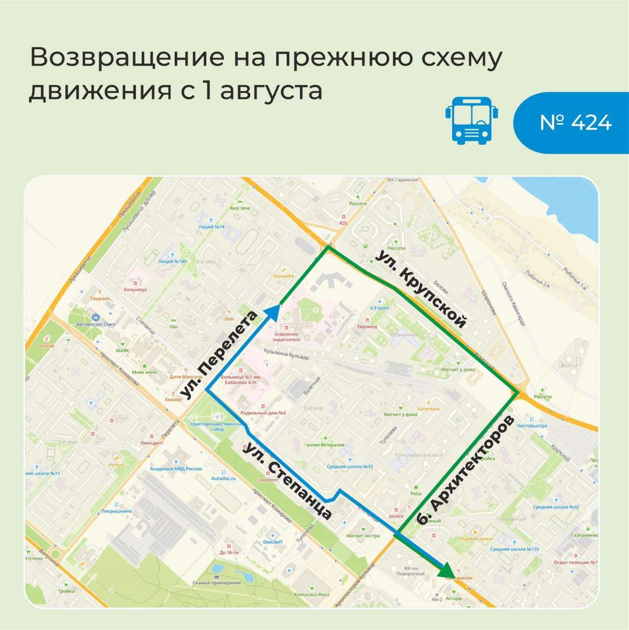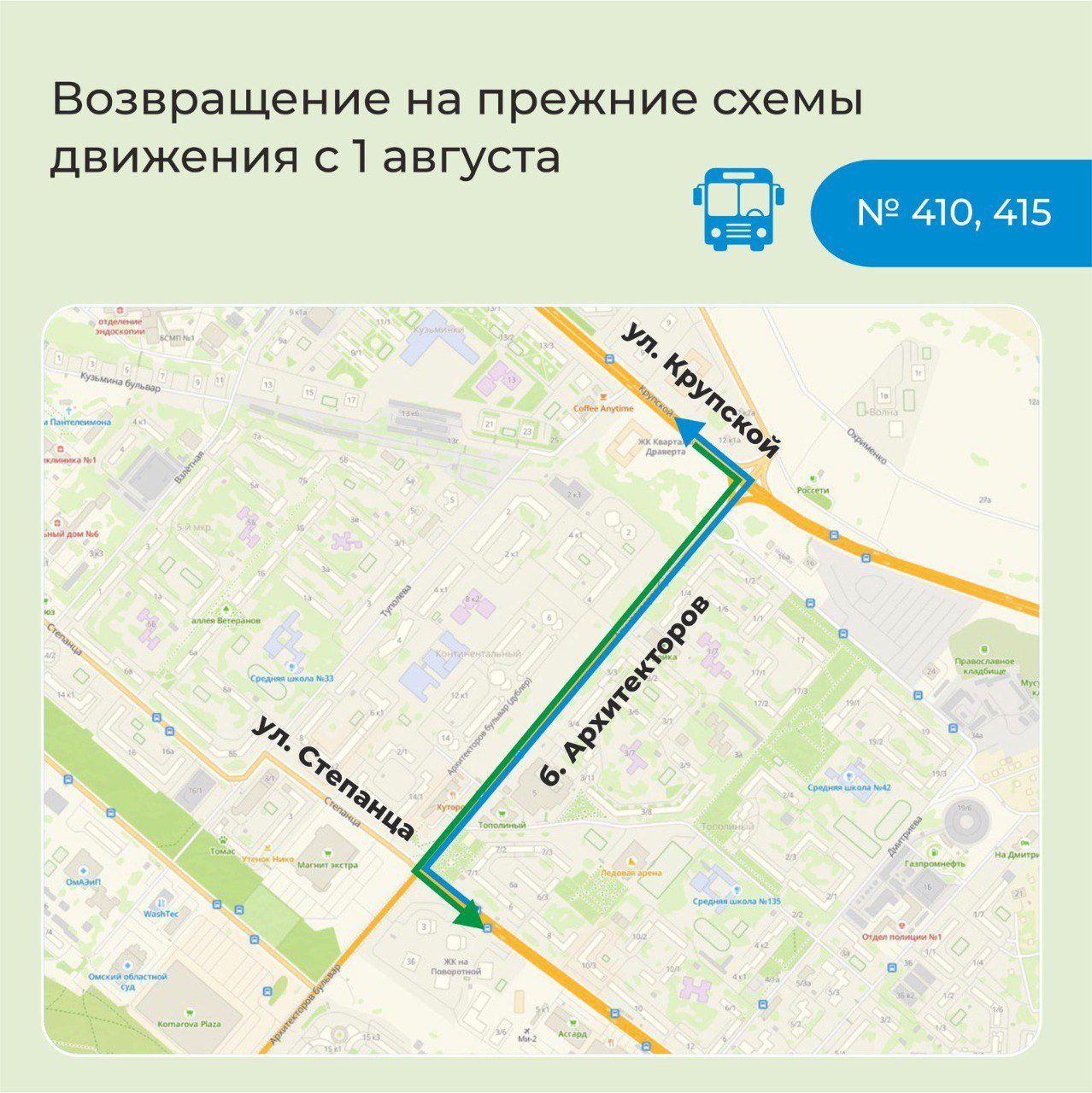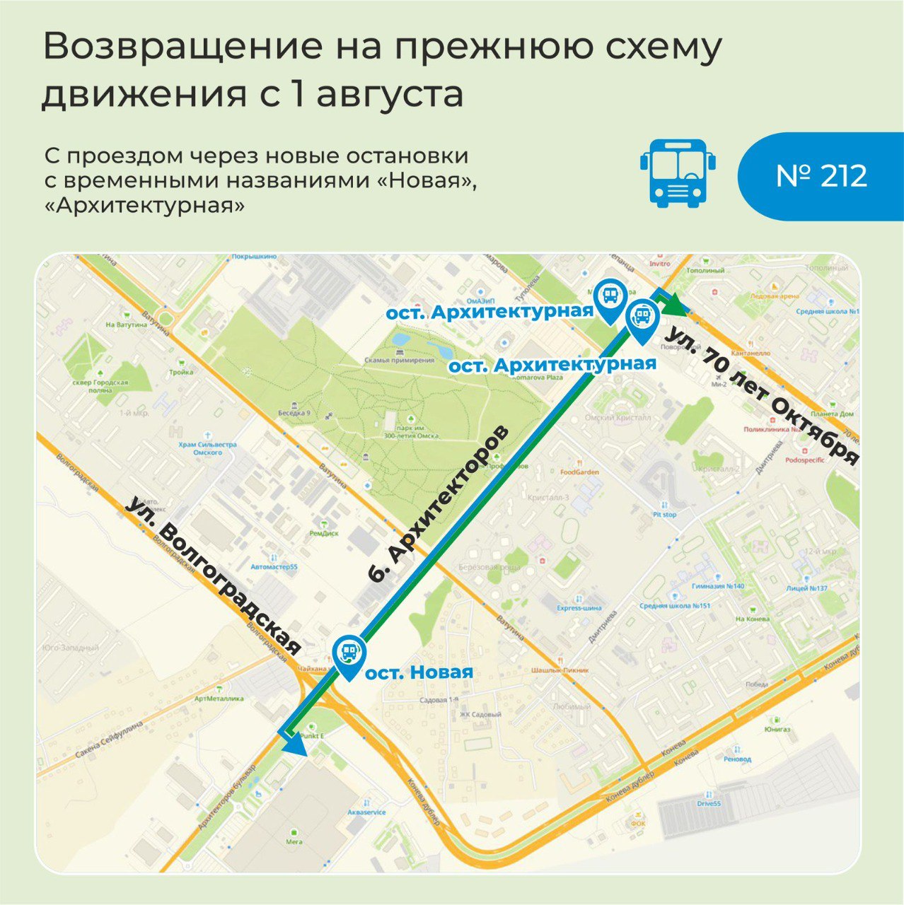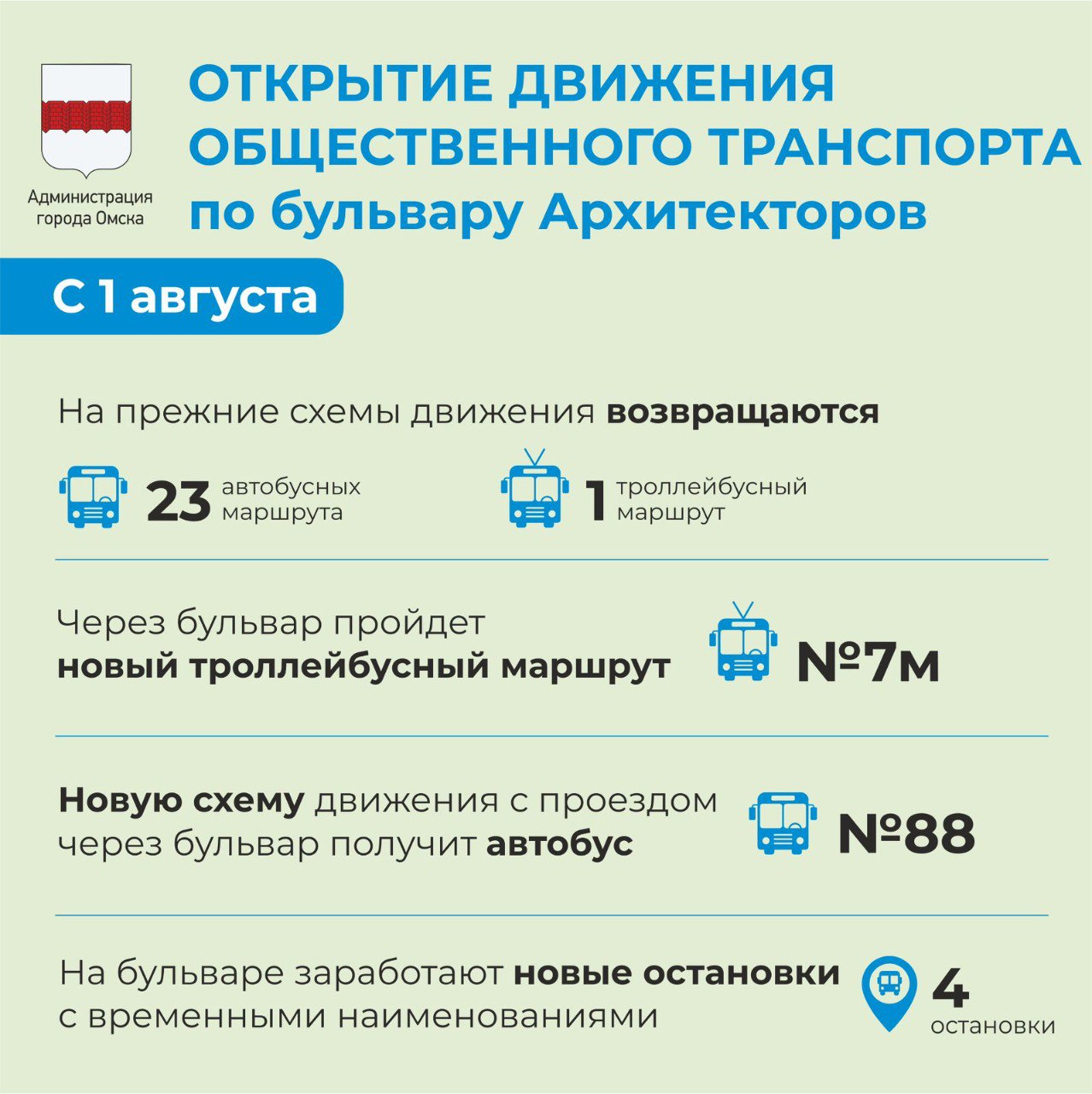 В Омске в четверг, 31 июля 2025 года, открыли проезд по реконструированному бульвару Архитекторов, в связи с чем туда возвращается городской пассажирский транспорт. Мэр Омска Сергей Шелест сообщил, что автобусы поедут по привычным для омичей схемам уже сегодня, а с обновленными маршрутными картами и трафаретами – с пятницы, 1 августа. В том числе с 1 августа возобновится и движение троллейбусов на Левобережье.